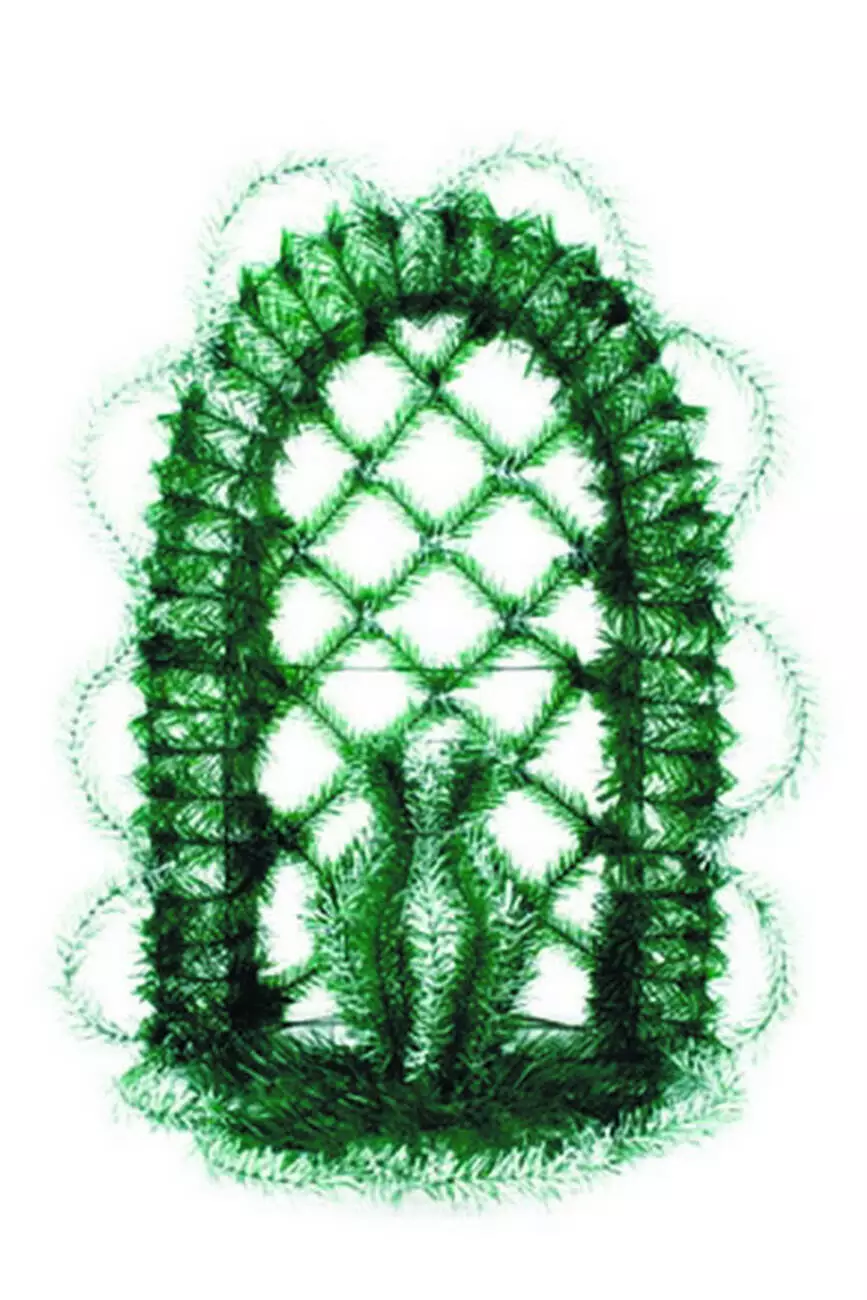 Арка зі штучної хвої з сіткою і двокольоровой вазою в центрі арки.