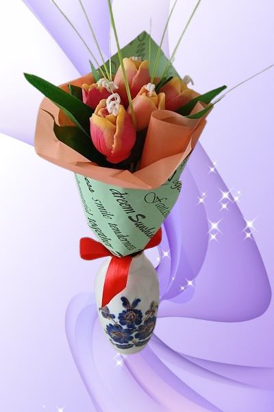 Вишуканий та оригінальний аромабукет із п’яти соєвих свічок у формі тюльпанів – це вишуканий подарунок, що дарує затишок та весняний настрій. Кожна свічка виконана вручну та зібрана в стильну композицію, загорнуту у гарний пакувальний папір, створюючи ефект справжнього букета.