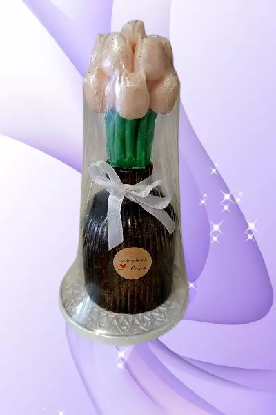 Вишукана та стильна аромасвічка "Весняний букет" – Букет тюльпанів" – це ніжне поєднання витонченого дизайну та чарівного аромату. Свічка виконана у формі чарівного букета тюльпанів, розташованого в декоративній гіпсовій вазочці, яка надає композиції елегантності.