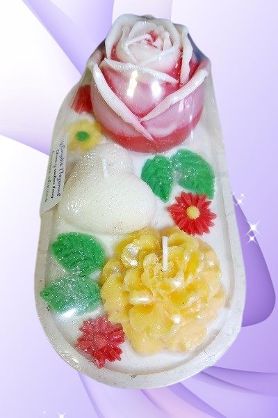 Вишукана композиція "Квіткова симфонія" – це гармонія краси та затишку. Кілька видів соєвих свічок у формі квітів розташовані на овальній гіпсовій підложці, створюючи витончену квіткову картину.