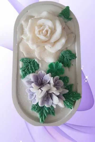 Вишукана композиція "Квіткова симфонія" – це гармонія краси та затишку. Кілька видів соєвих свічок у формі квітів розташовані на овальній гіпсовій підложці, створюючи витончену квіткову картину.