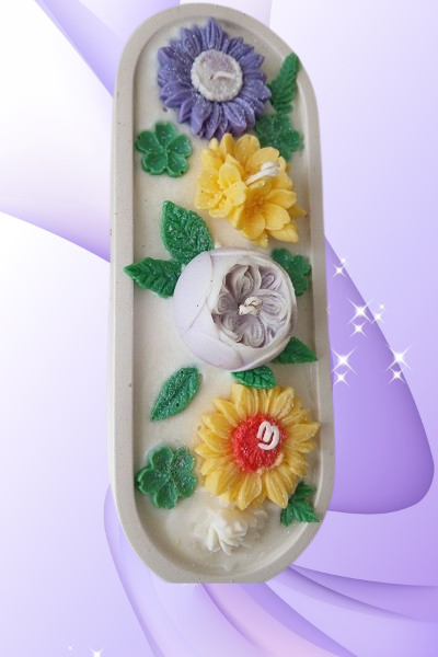 Вишукана композиція "Квіткова симфонія" – це гармонія краси та затишку. Кілька видів соєвих свічок у формі квітів розташовані на овальній гіпсовій підложці, створюючи витончену квіткову картину.