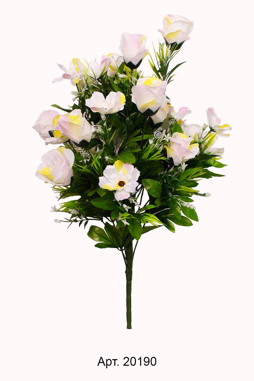 щільного шовку. Букет штучних квітів оформлений пластмасовою
