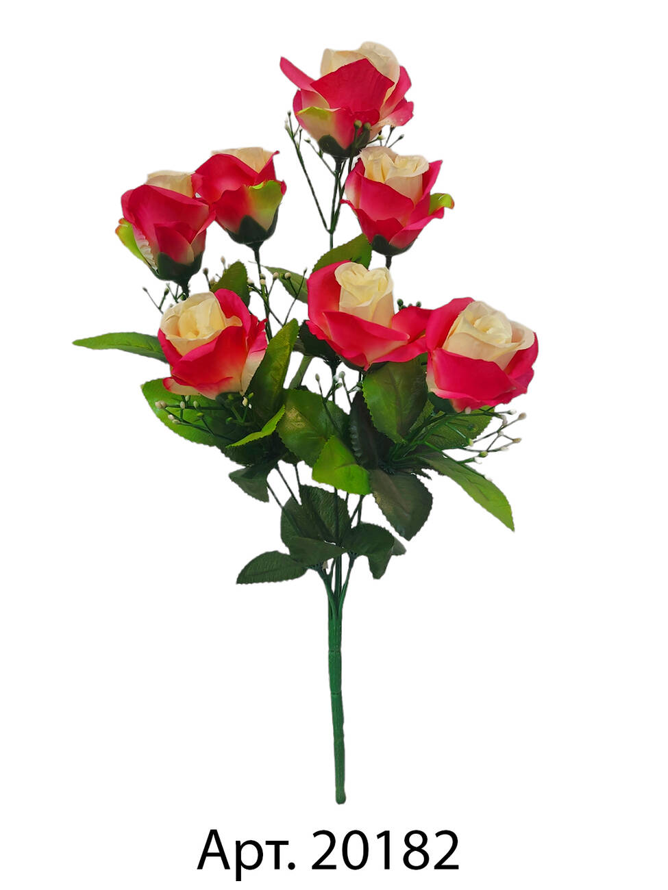 Штучний букет з 7 троянд з шовку у бутоні. Листя троянд з шовку.