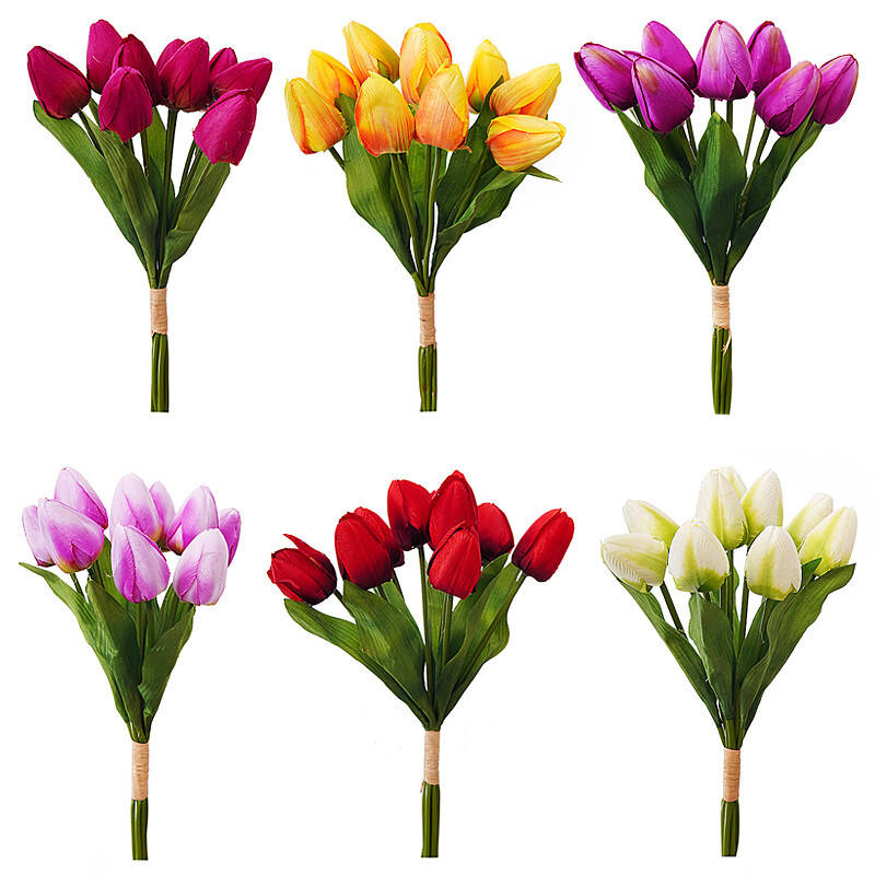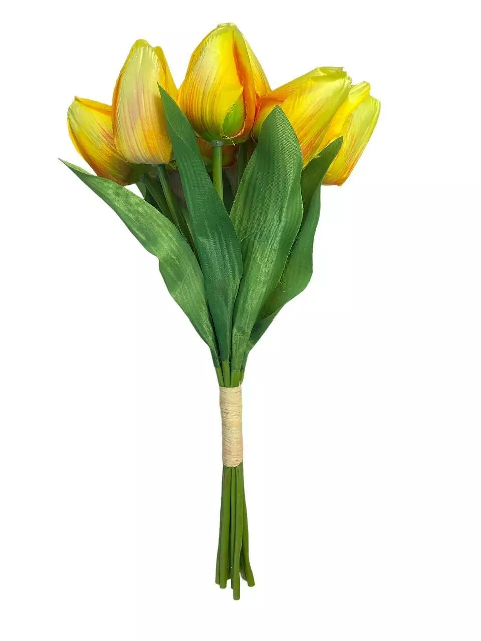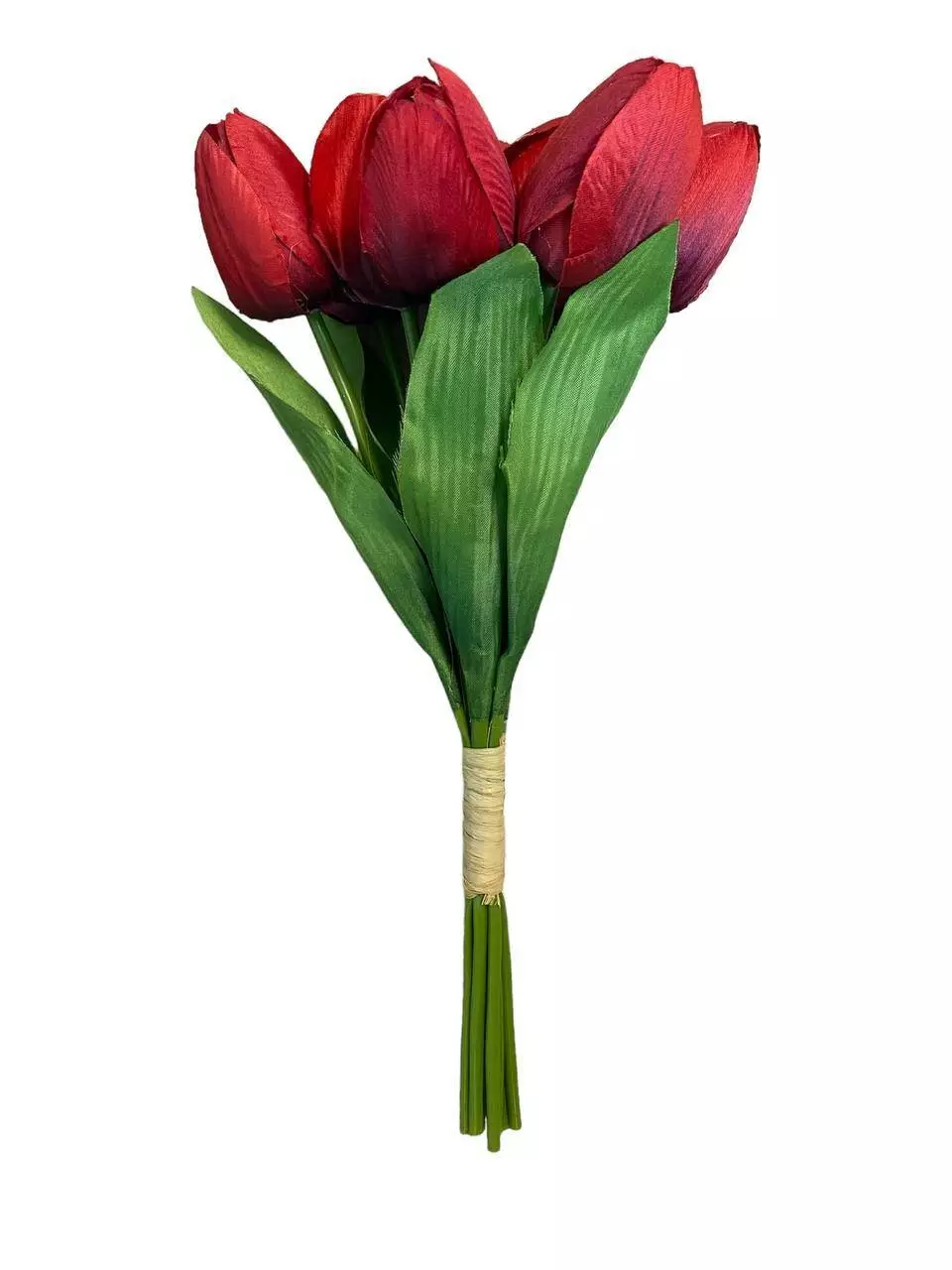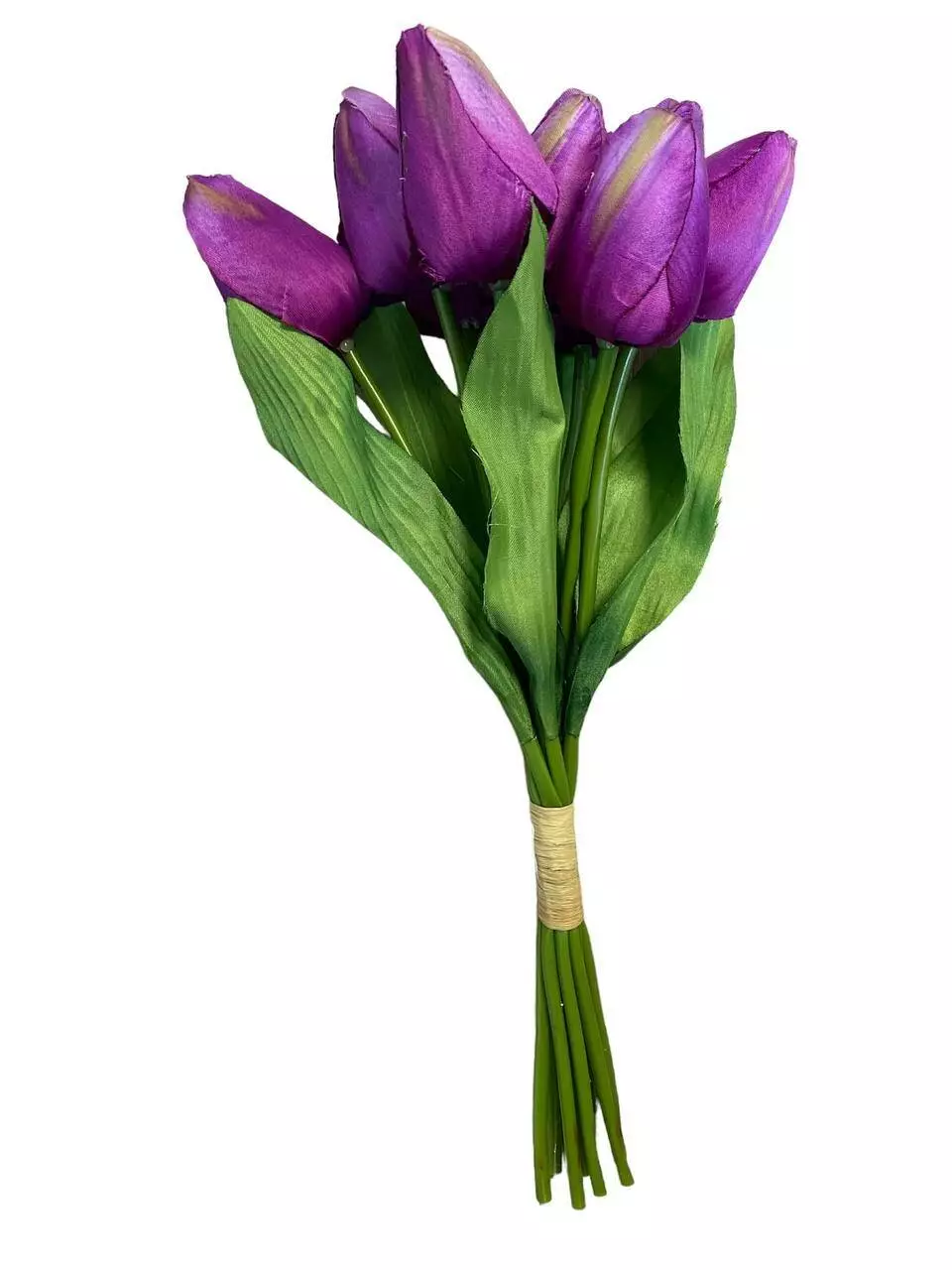 Букет атласних тюльпанів на 9 голів (закриті бутони) з листочками,