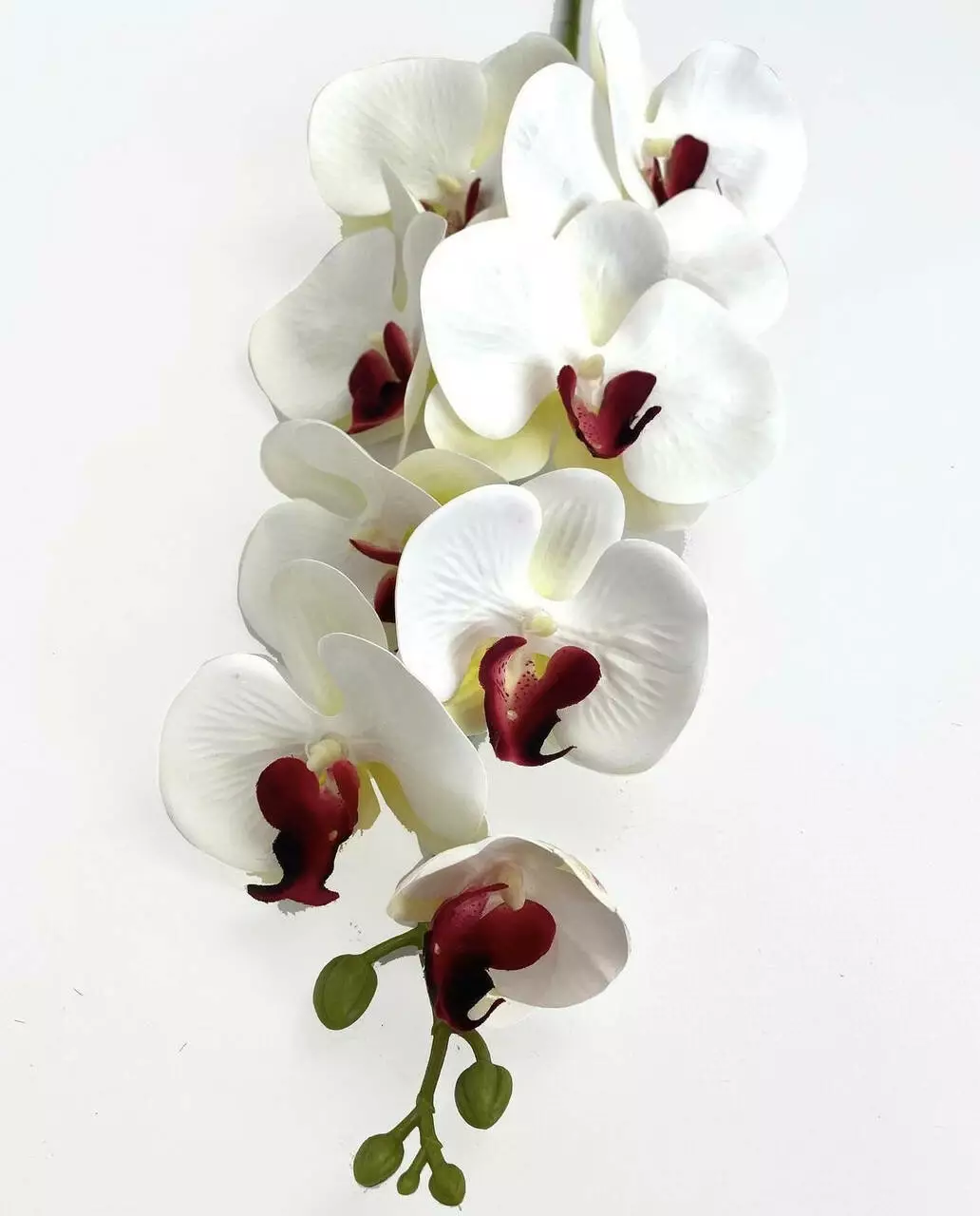 Гілка орхідеї штучна на 9 суцвіть, білий з червоними серединками, 95 см