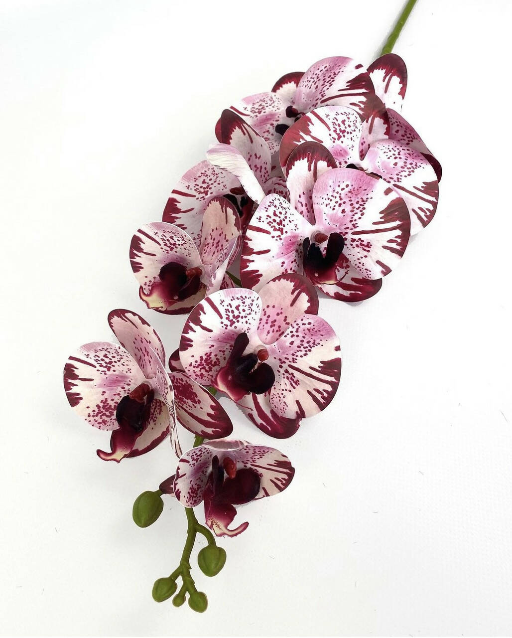 Гілка орхідеї штучна на 9 суцвіть, біло-бордовий, 95 см