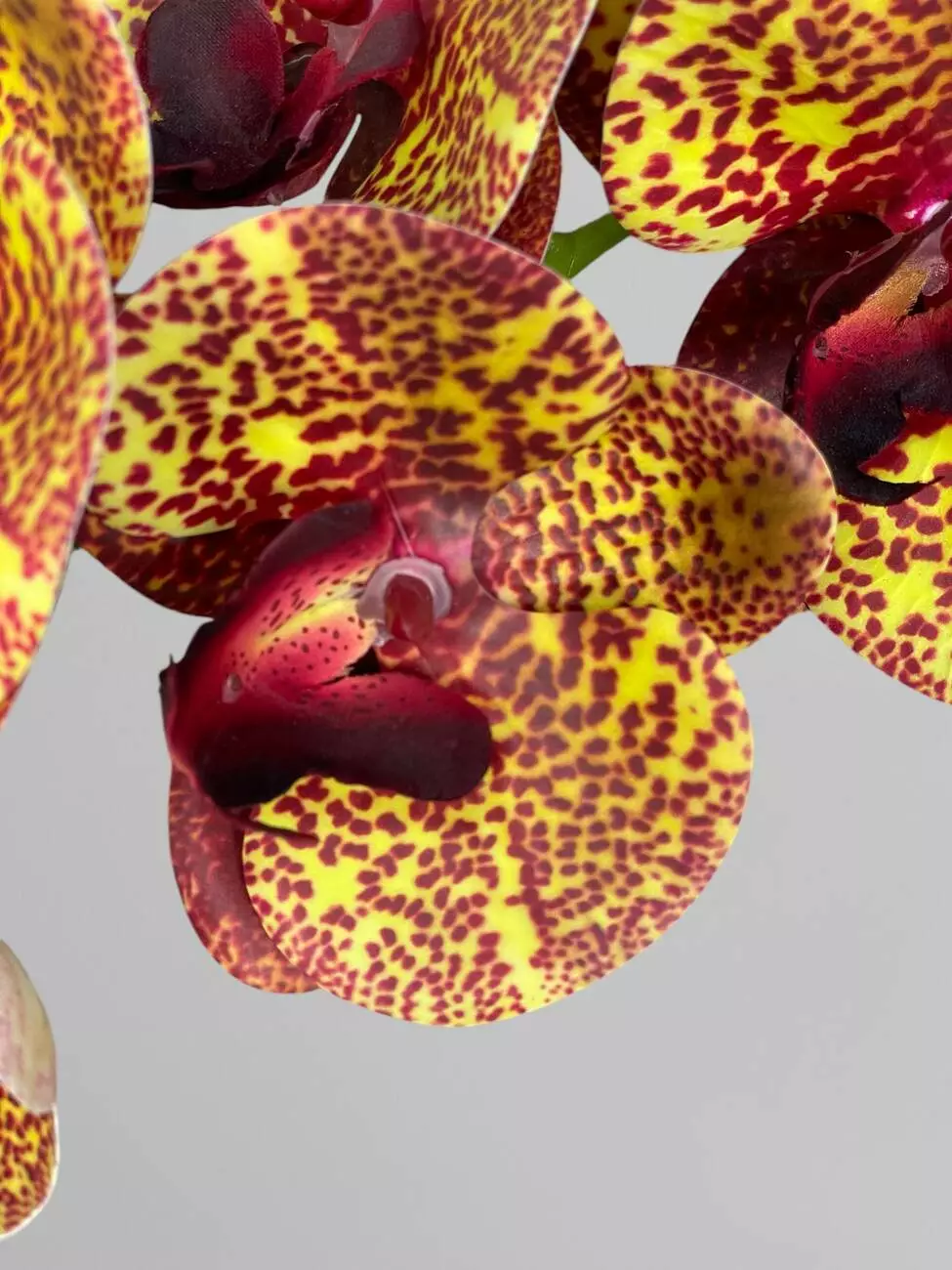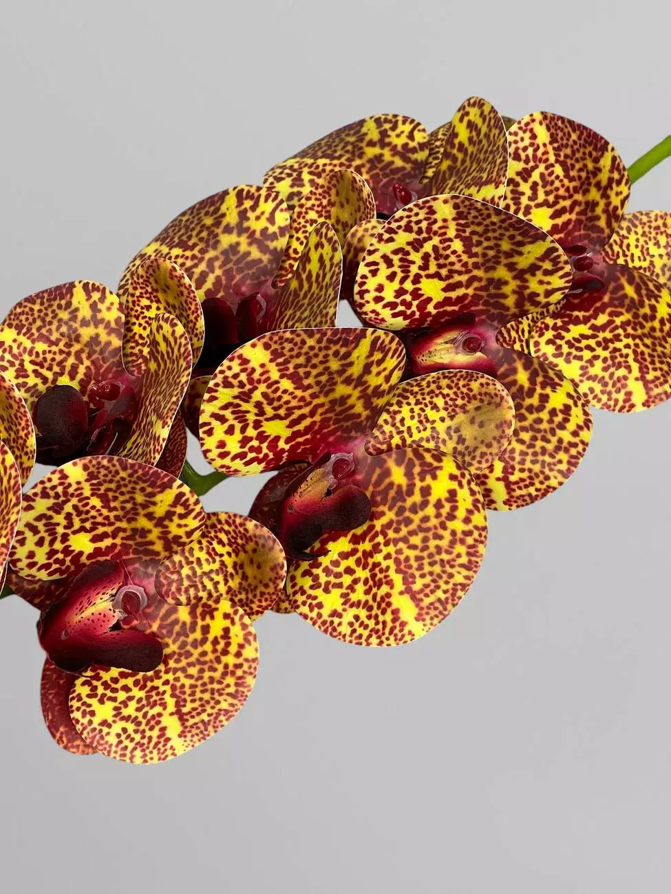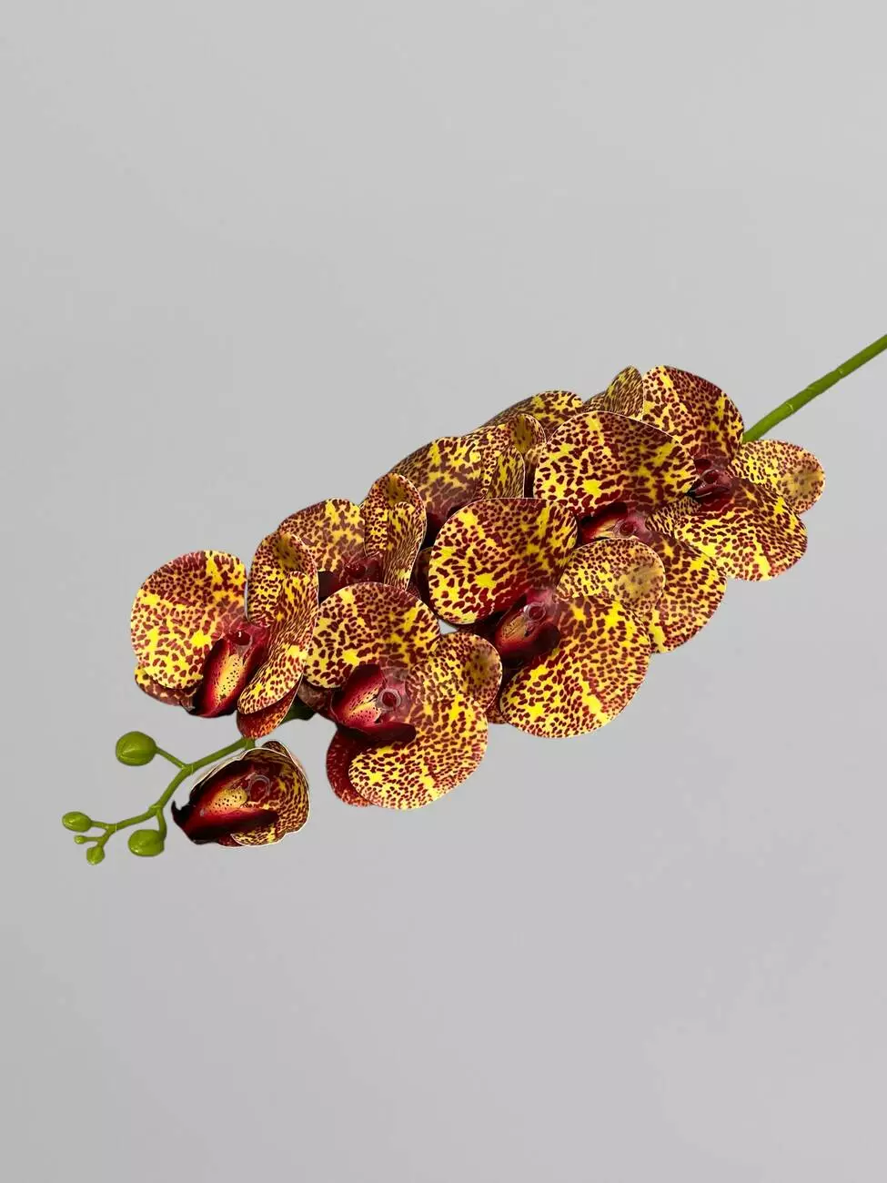 Гілка орхідеї штучна на 9 суцвіть, насичено-жовтий у бордову крапку, 95 см