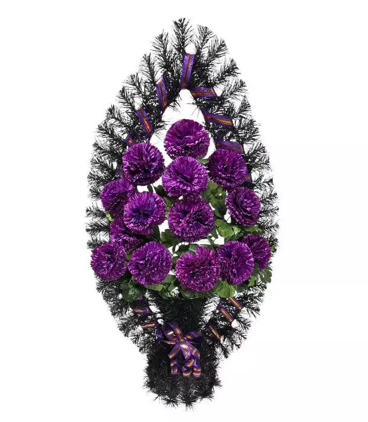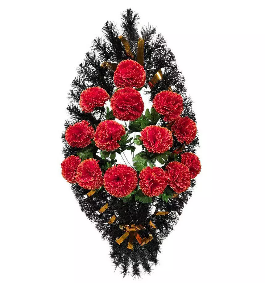 прикрашений букетом гвоздики та ритуальною стрічкою. Кольорову гаму