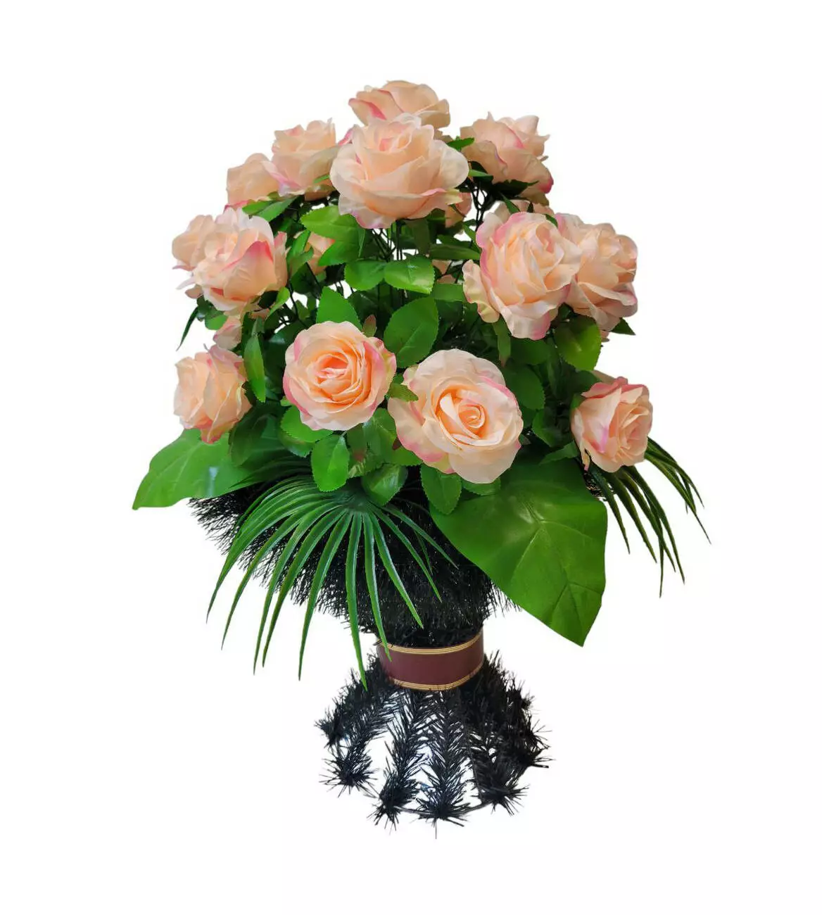 прикрашений букетом троянд, папороттю, листям пальми та ритуальною