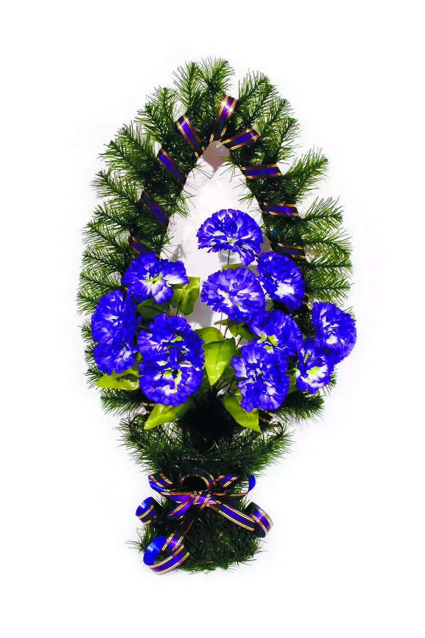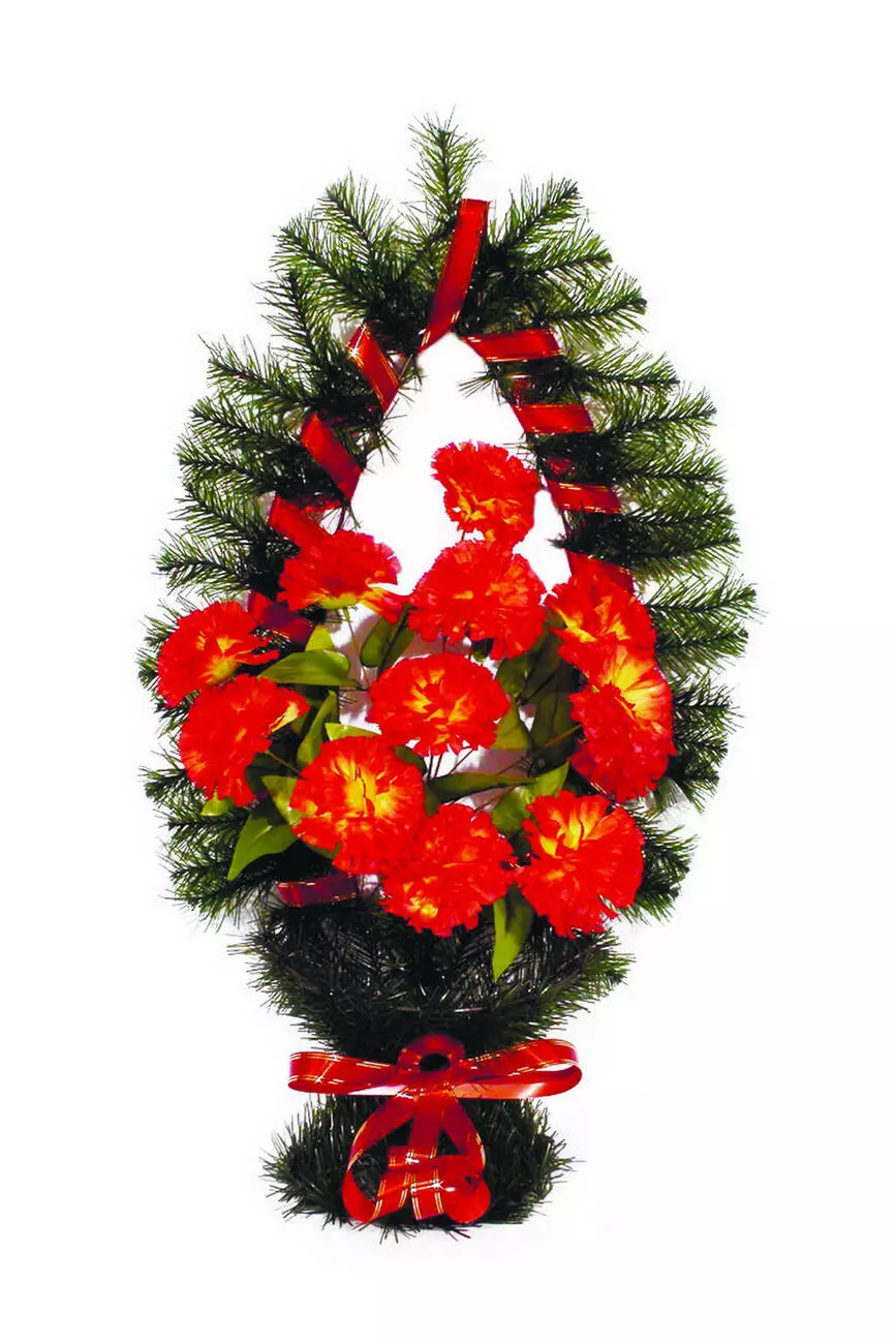 Корзина украшена букетом гвоздики и ритуальной лентой. Цветовую