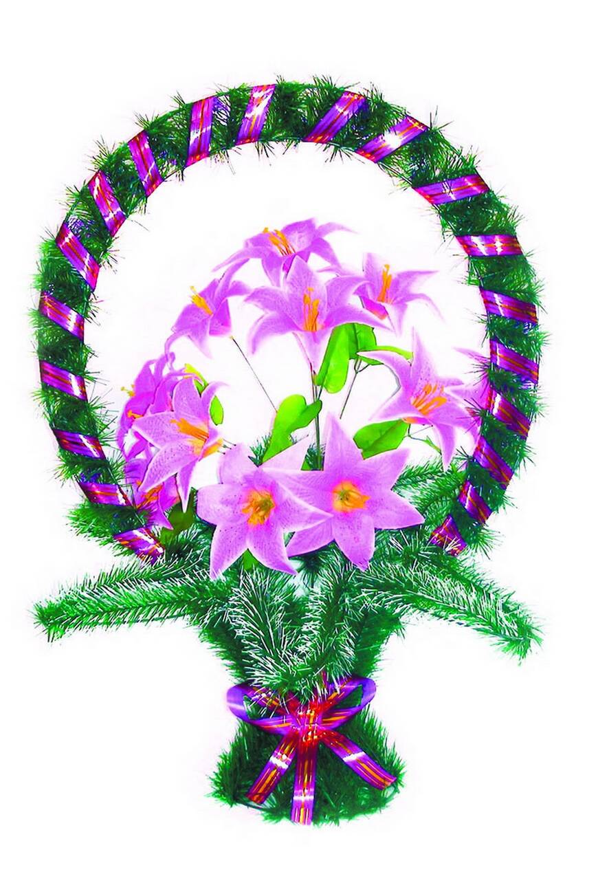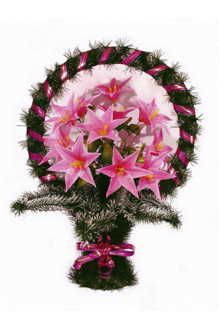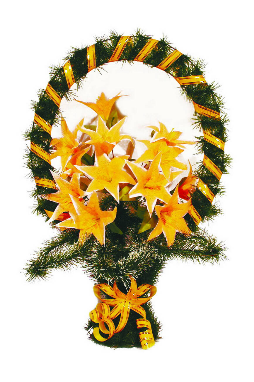 прикрашений букетом лілії та ритуальною стрічкою. Кольорову гаму на