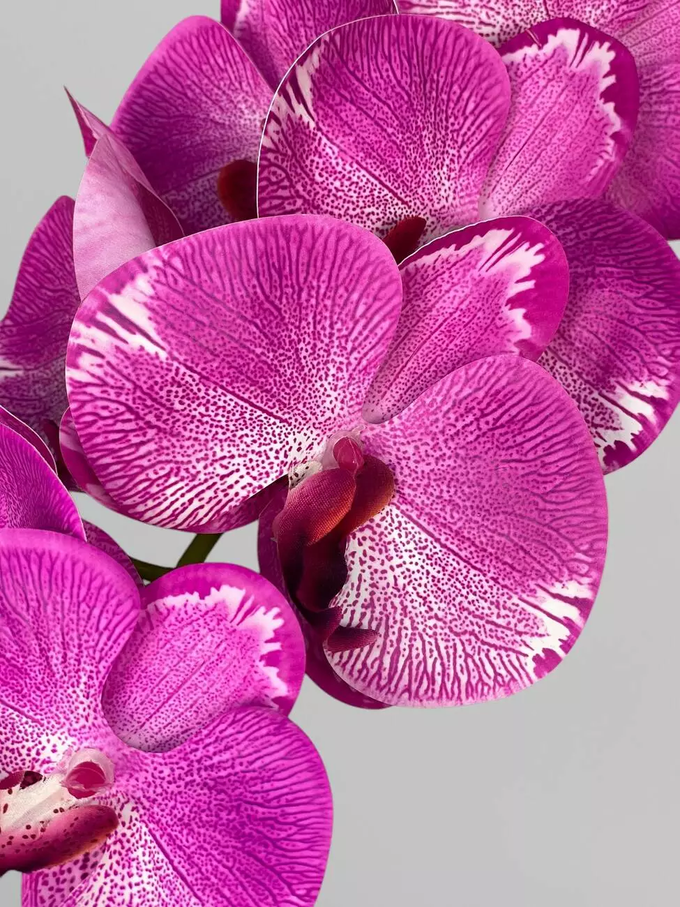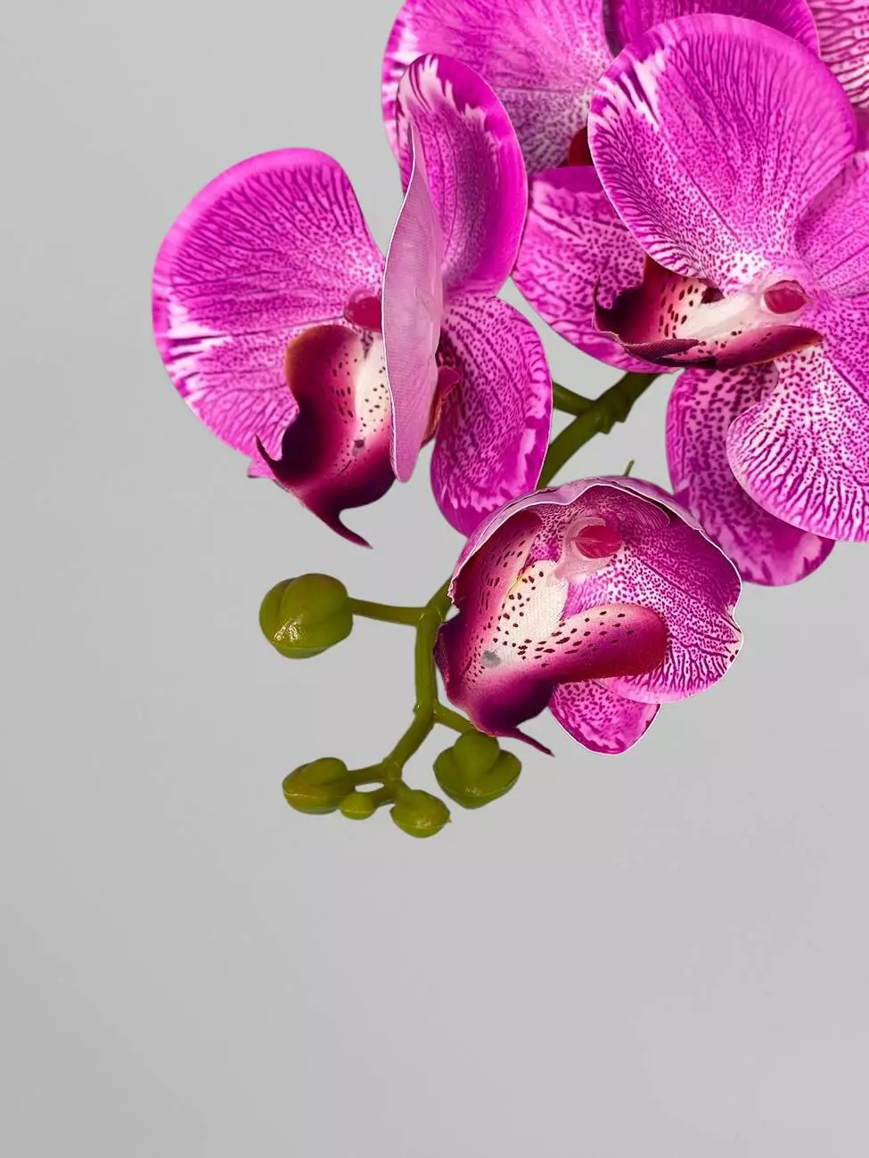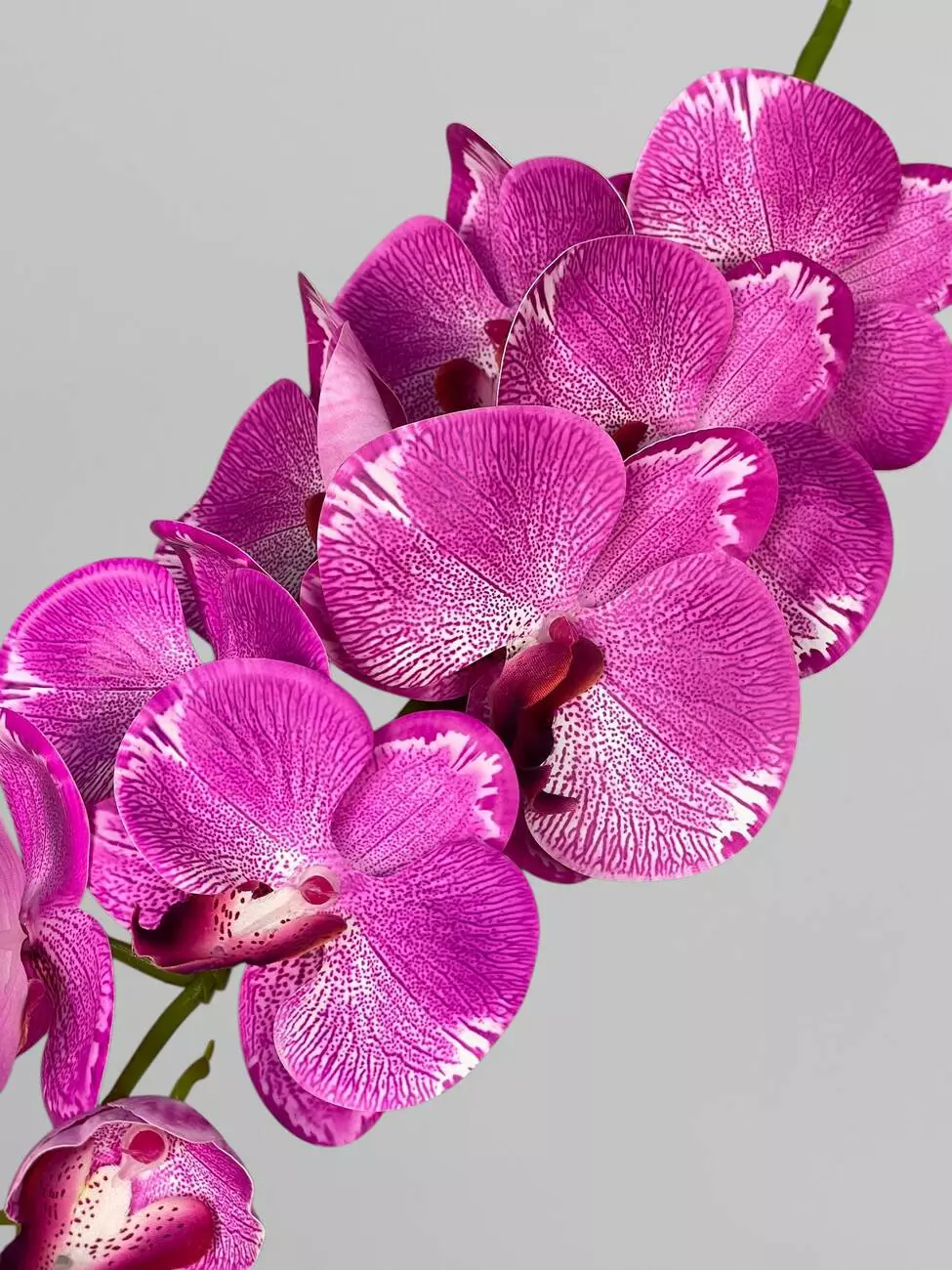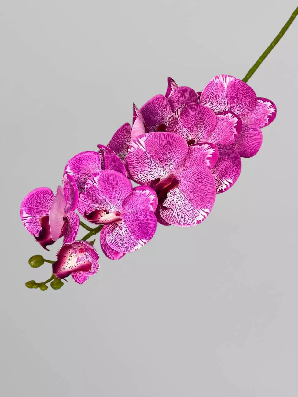 Латексна гілка штучної орхідеї на 9 суцвіть, фуксія з білосніжними вкрапленнями, 95 см