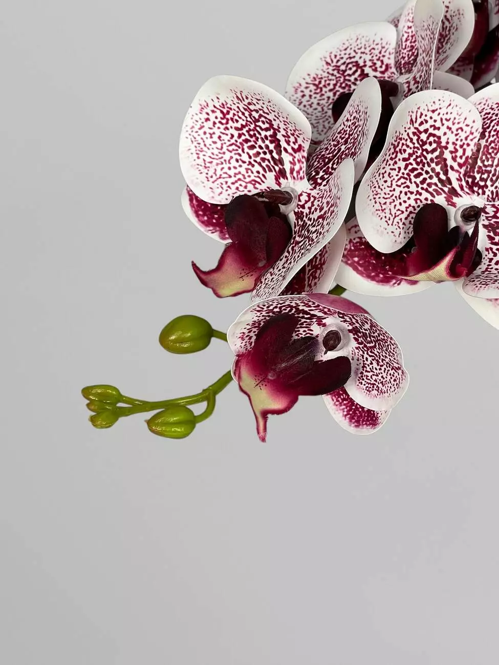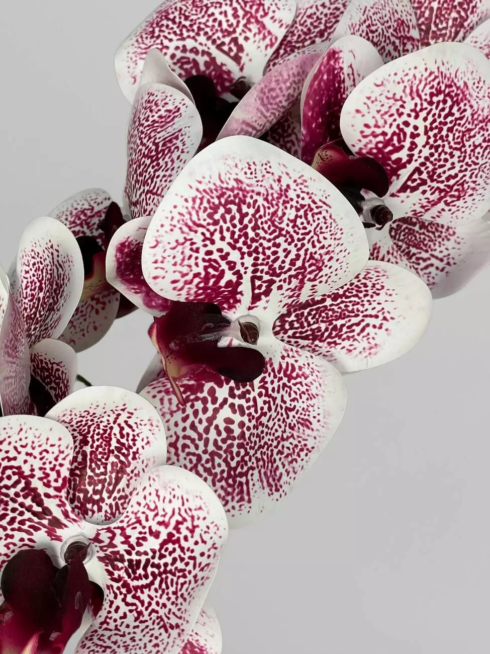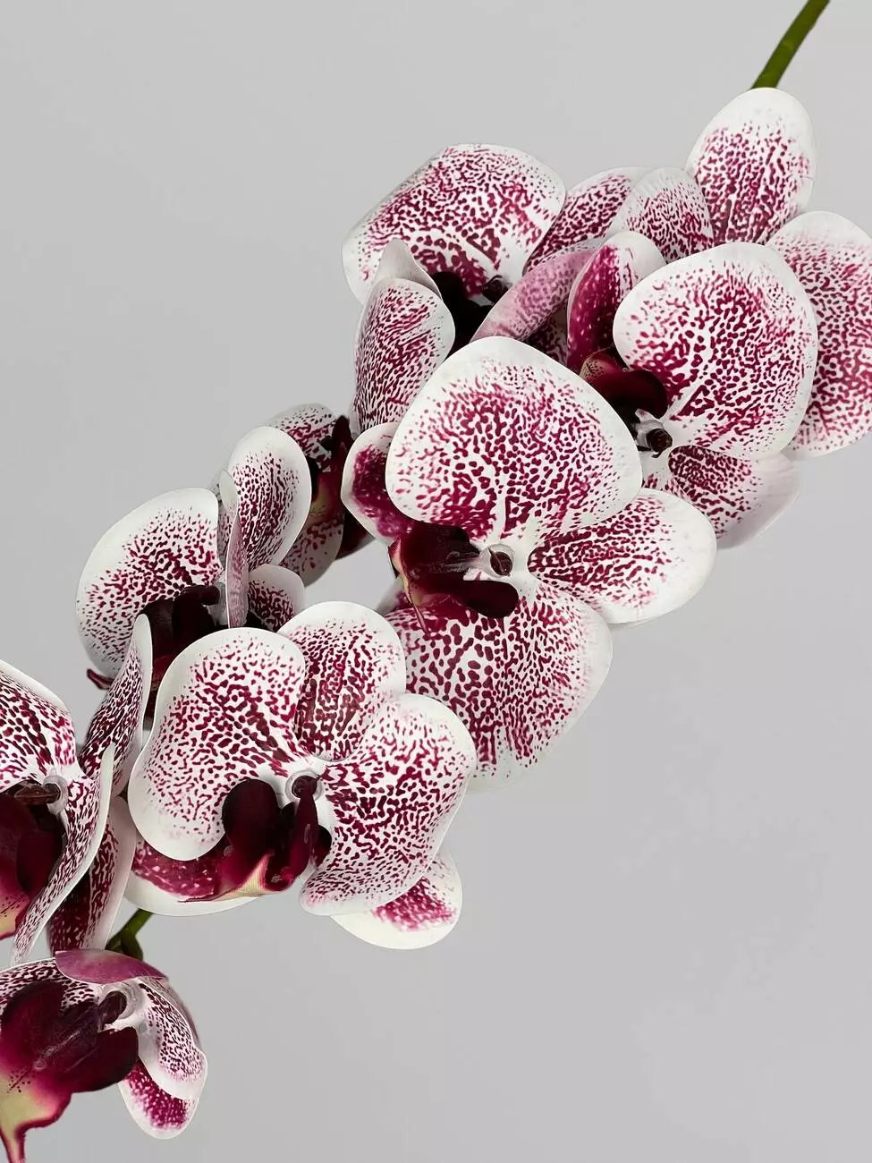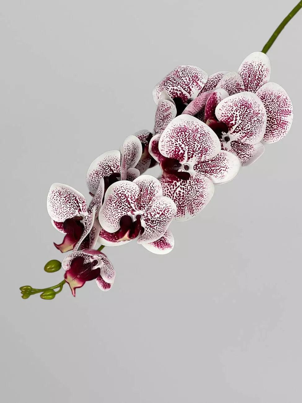 Штучна гілка орхідеї на 9 суцвіть, білий в бордову краплинку, 95 см