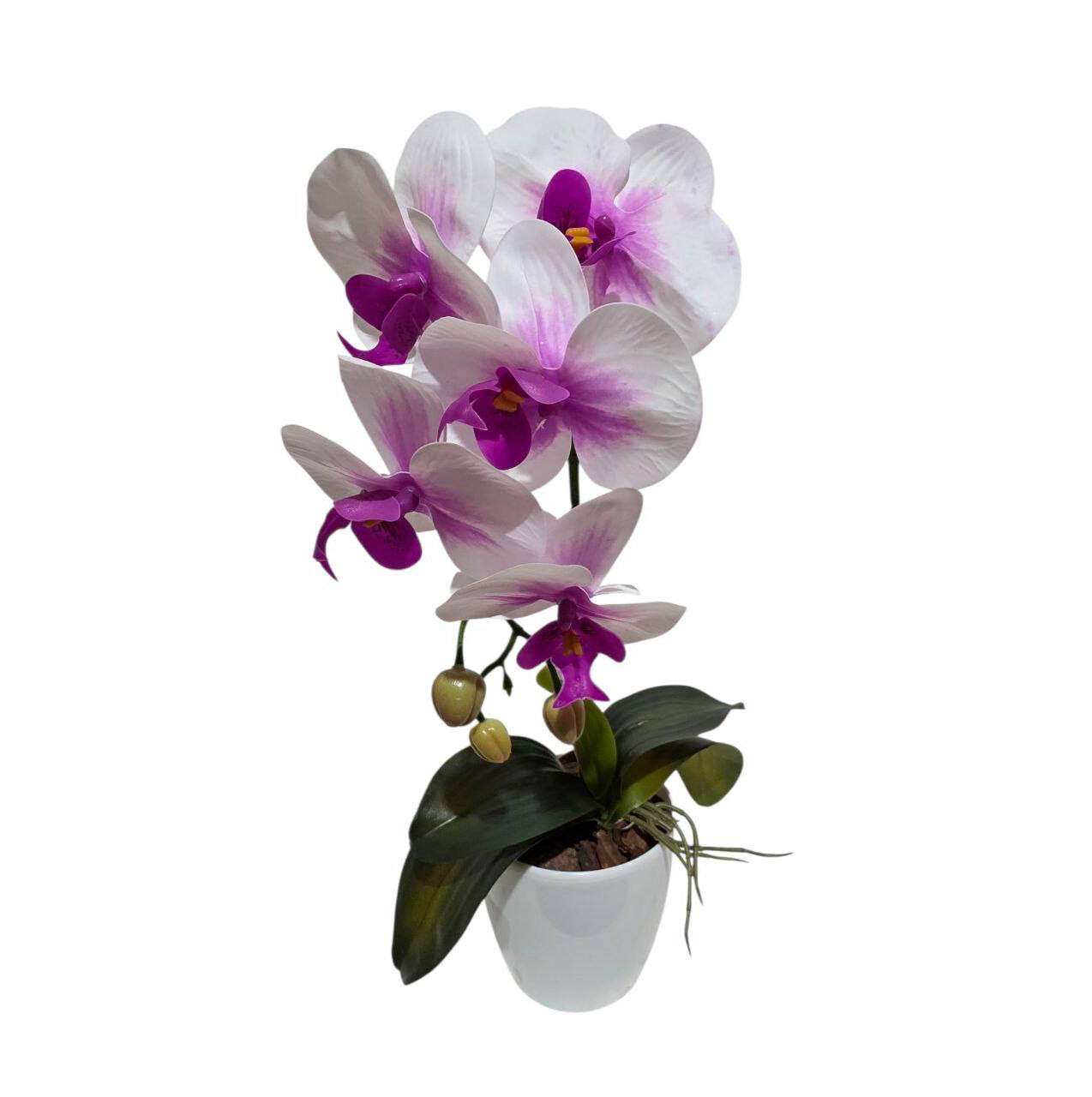 Орхідея біло-фіолетова одинарна з латексу у пластмасовому білому