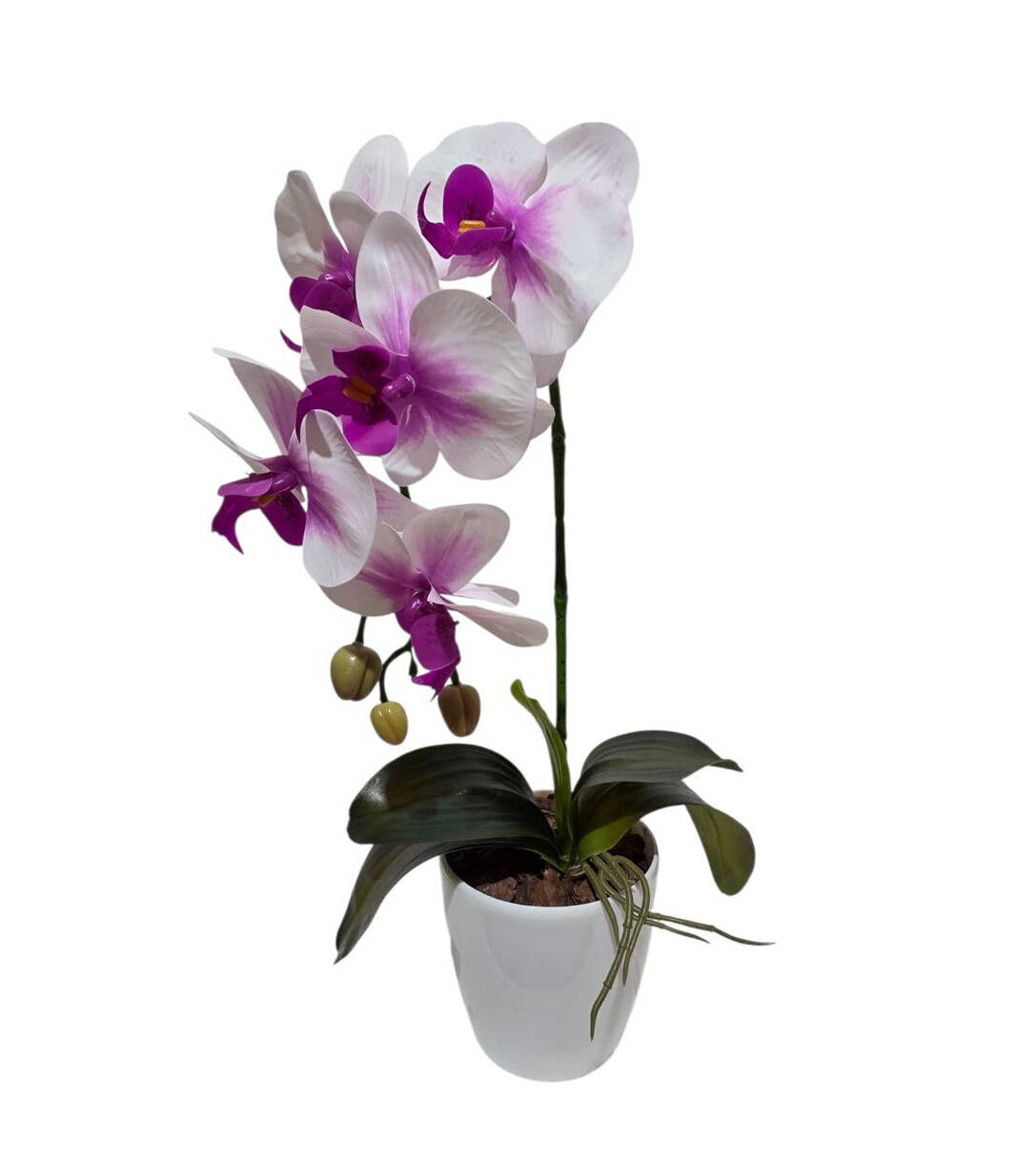 Штучна орхідея в горщику одинарна біло-фіолетова на 5 суцвіть 42*16см