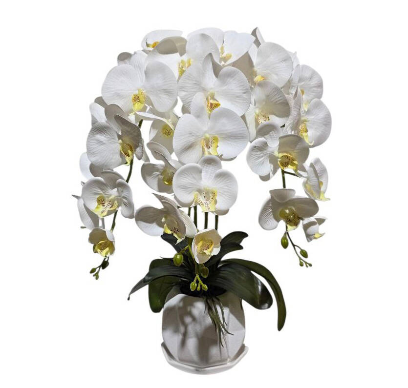 Штучна орхідея в горщику потрійна біла на 9 суцвіть 52*32см
