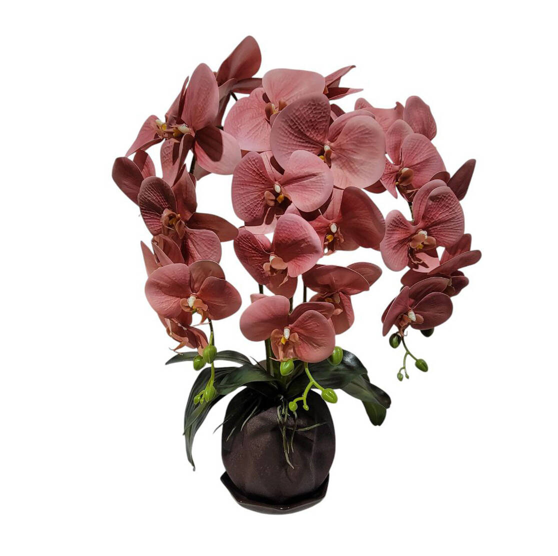 Штучна орхідея в горщику потрійна на 9 суцвіть коралова 52*32см