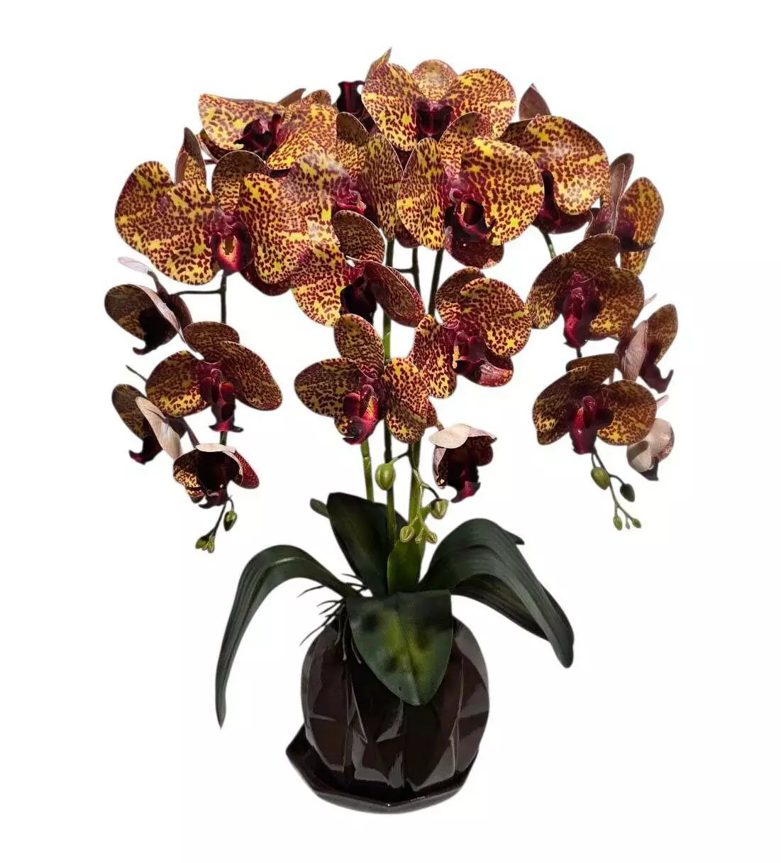 Штучна орхідея в горщику потрійна насичено-жовтий у бордову крапку на 9 суцвіть 52*32см