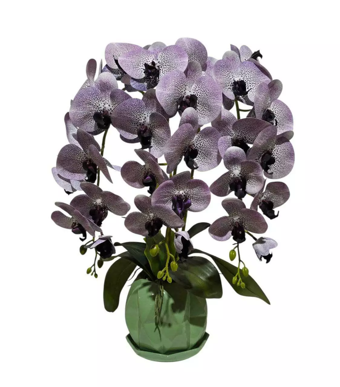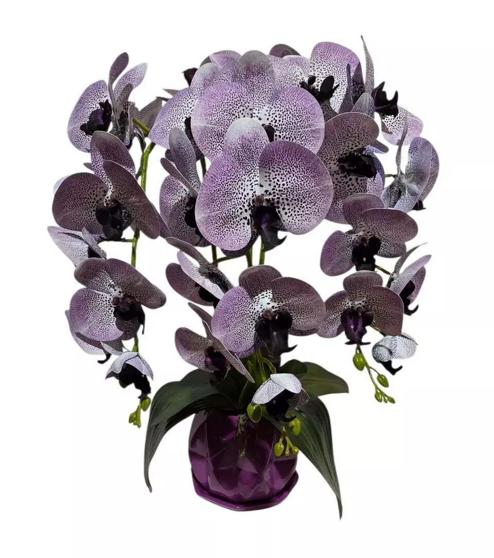 Штучна орхідея в горщику потрійна ніжно-бузковий з чорними цятками на 9 суцвіть 52*32см