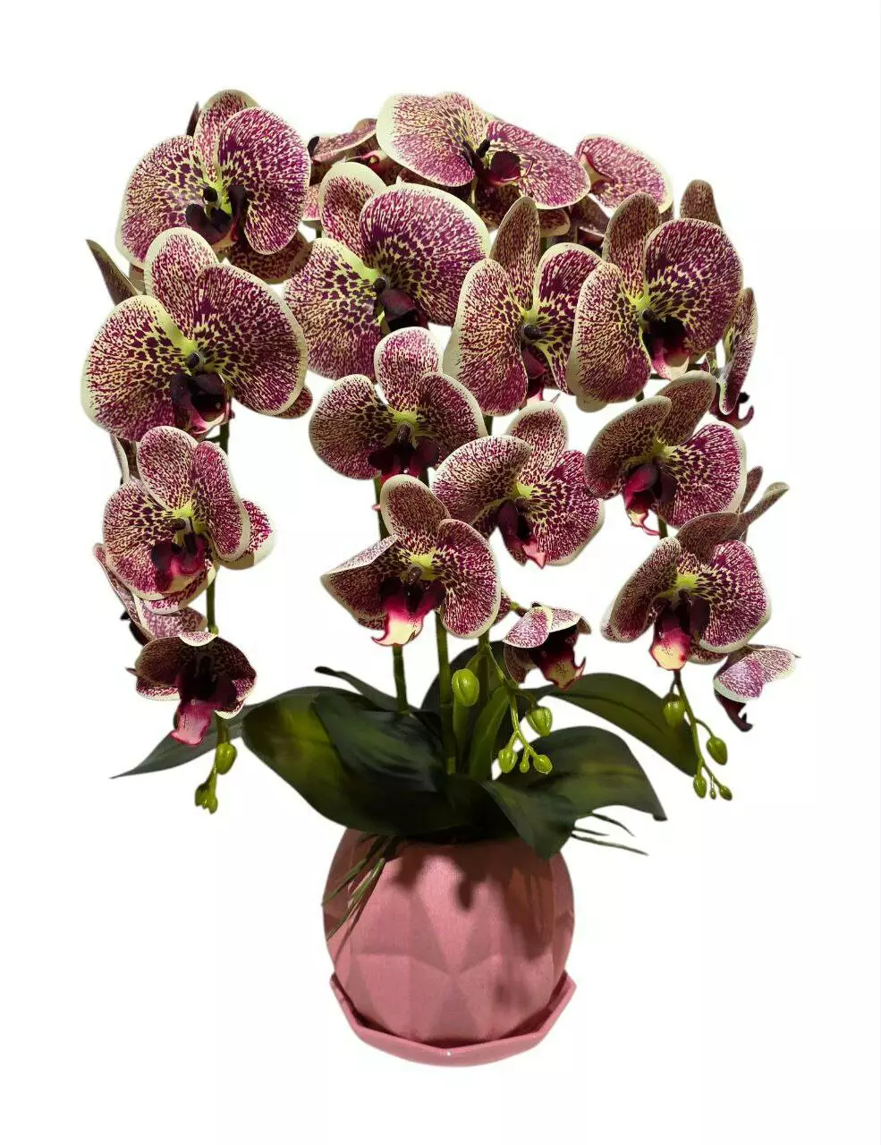 Штучна орхідея в горщику потрійна тигрово-бордова на 9 суцвіть 52*32см