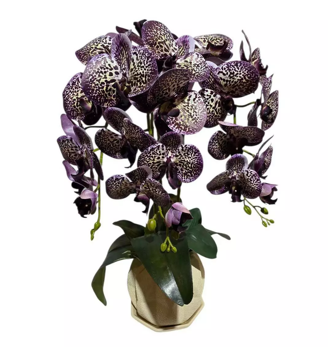 Штучна орхідея в горщику потрійна тигрово-фіолетова на 9 суцвіть 52*32см