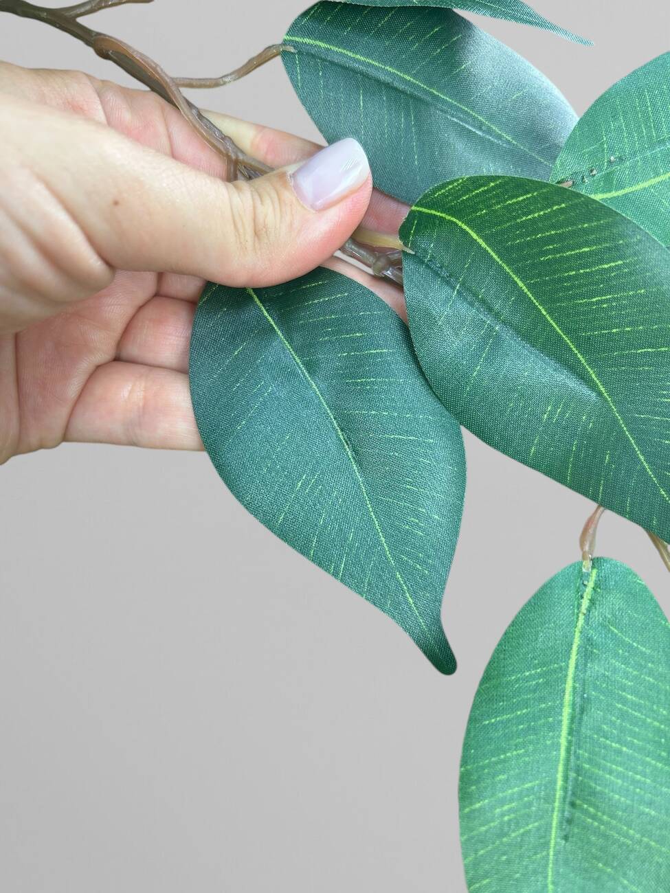 Рослина має реалістичний вигляд завдяки майстерно виконаним зеленим листям та витонченим вигнутим гілкам, що повторюють форму живого дерева. Листя виготовлене з високоякісного матеріалу, який точно імітує текстуру та колір справжнього фікуса. Стильна конструкція забезпечує стабільність і природний вигляд рослини.