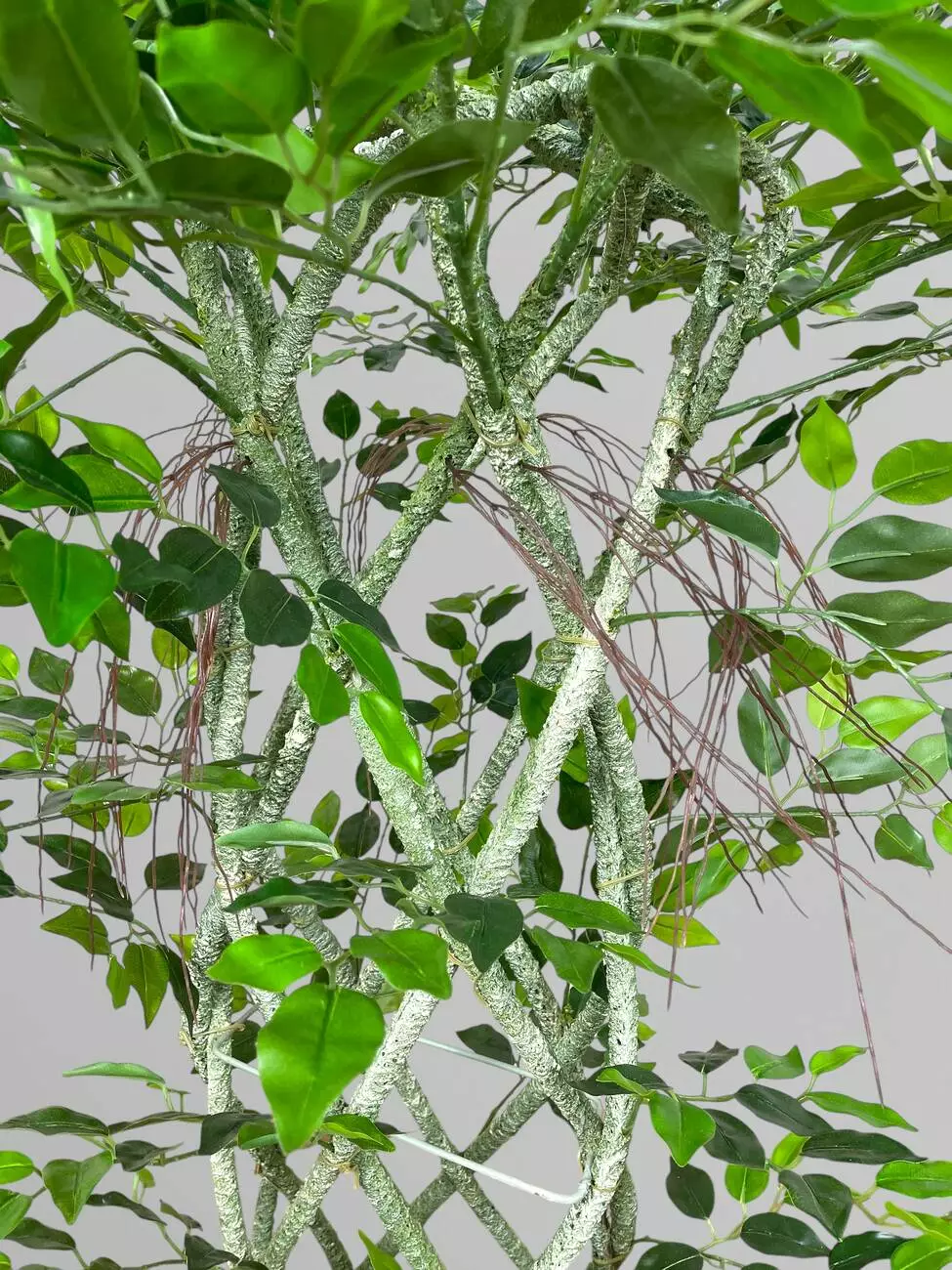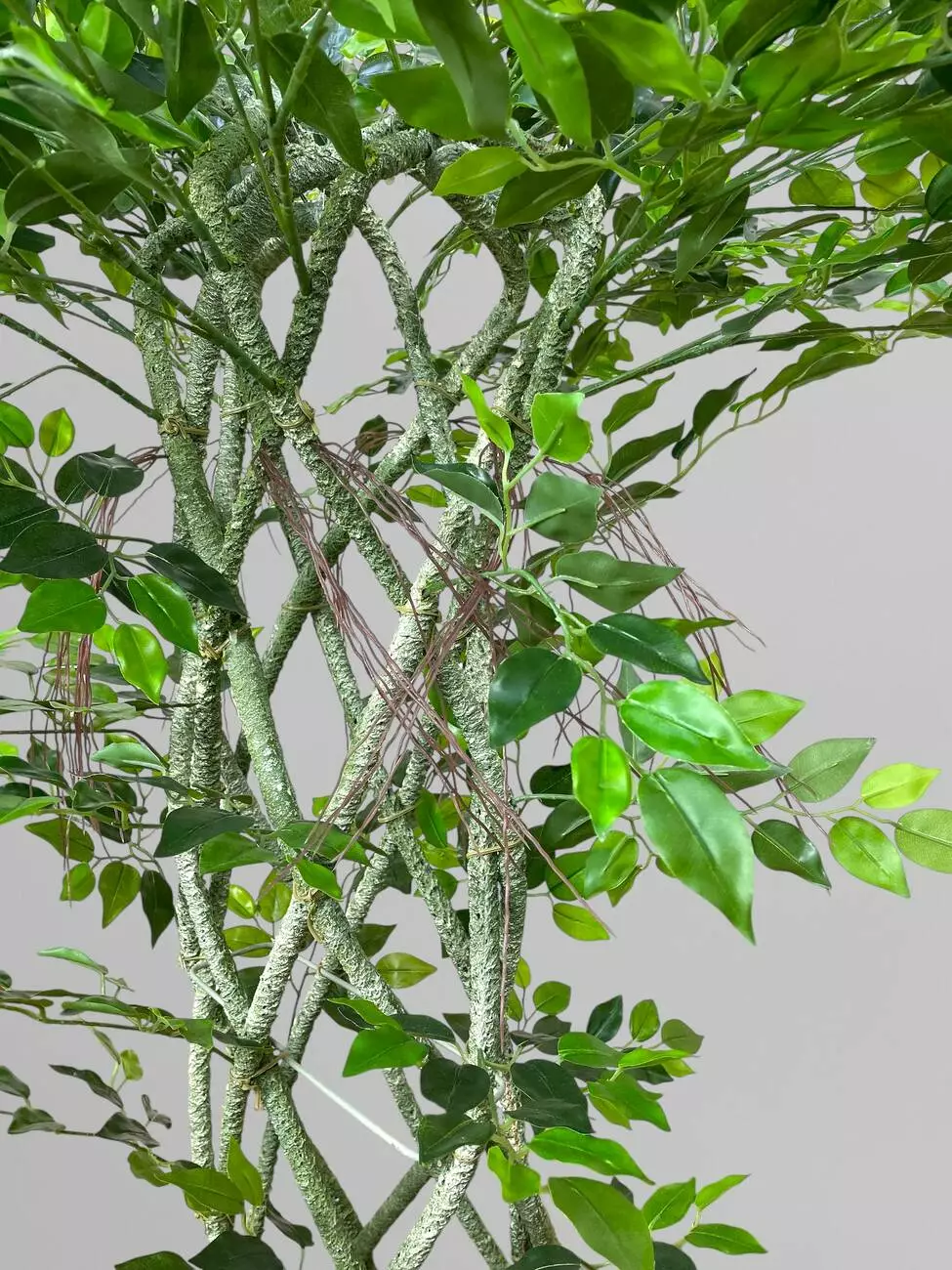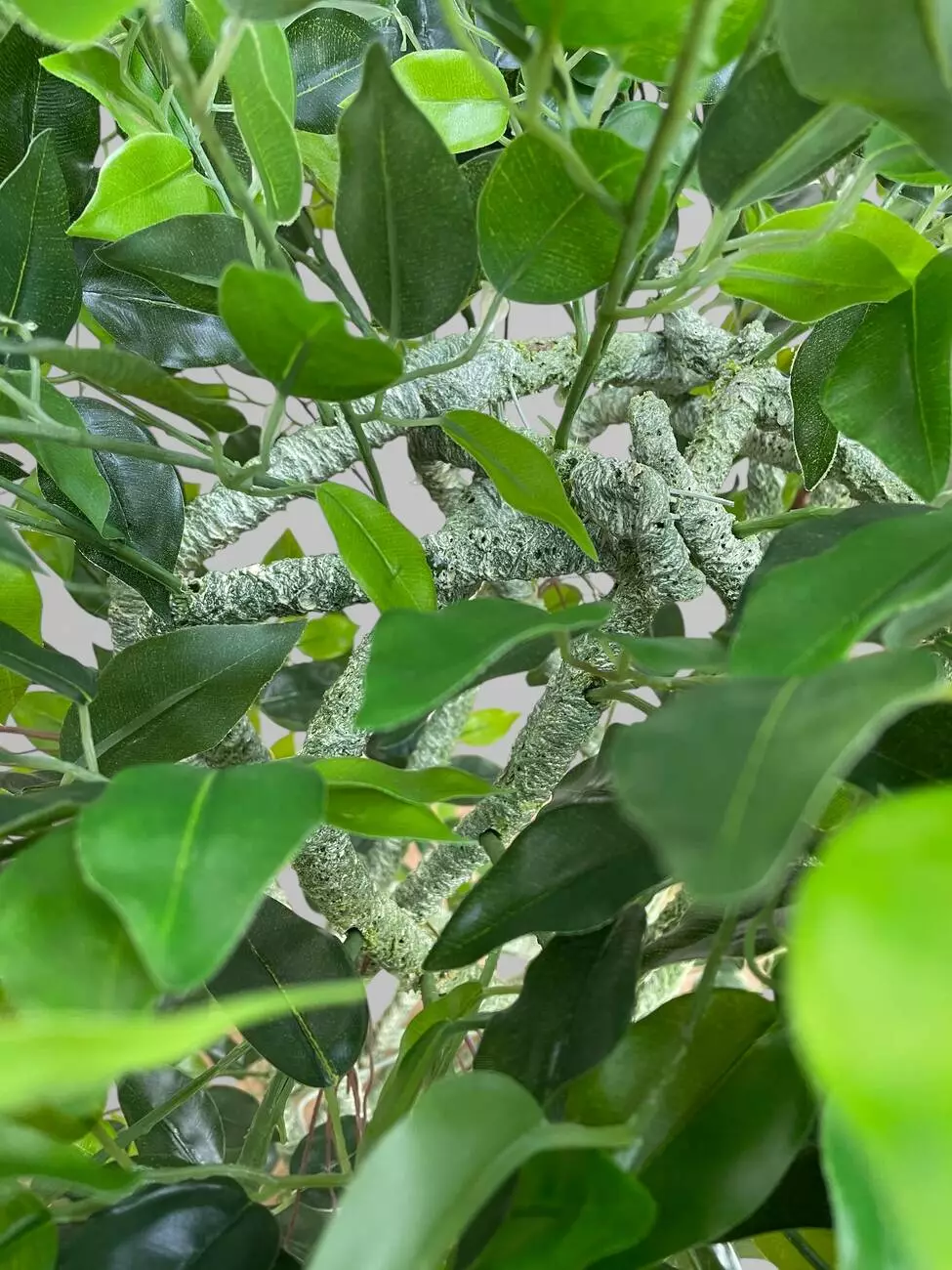 Рослина виконана з високоякісних матеріалів, які забезпечують реалістичний вигляд. Його густе зелене листя ретельно деталізоване, щоб максимально передати текстуру та колір живого дерева. Гнучкі гілки дозволяють регулювати форму фікуса, створюючи бажаний об’єм.
