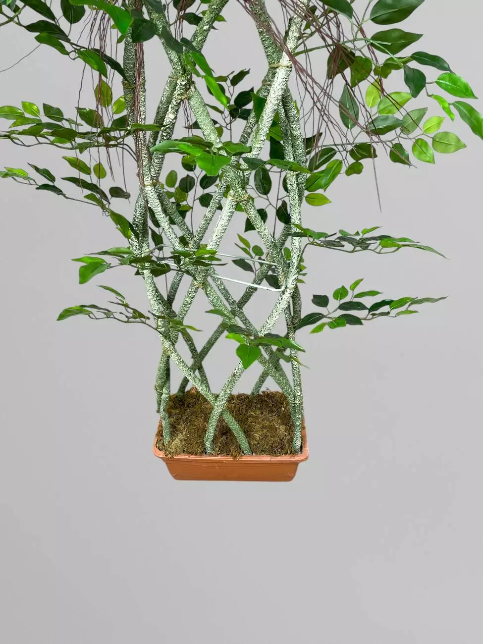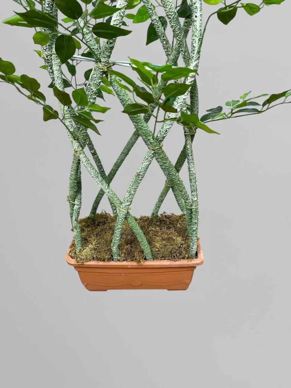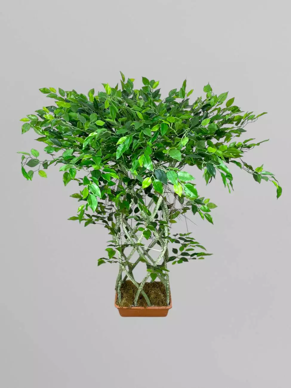 Рослина виконана з високоякісних матеріалів, які забезпечують реалістичний вигляд. Його густе зелене листя ретельно деталізоване, щоб максимально передати текстуру та колір живого дерева. Гнучкі гілки дозволяють регулювати форму фікуса, створюючи бажаний об’єм.