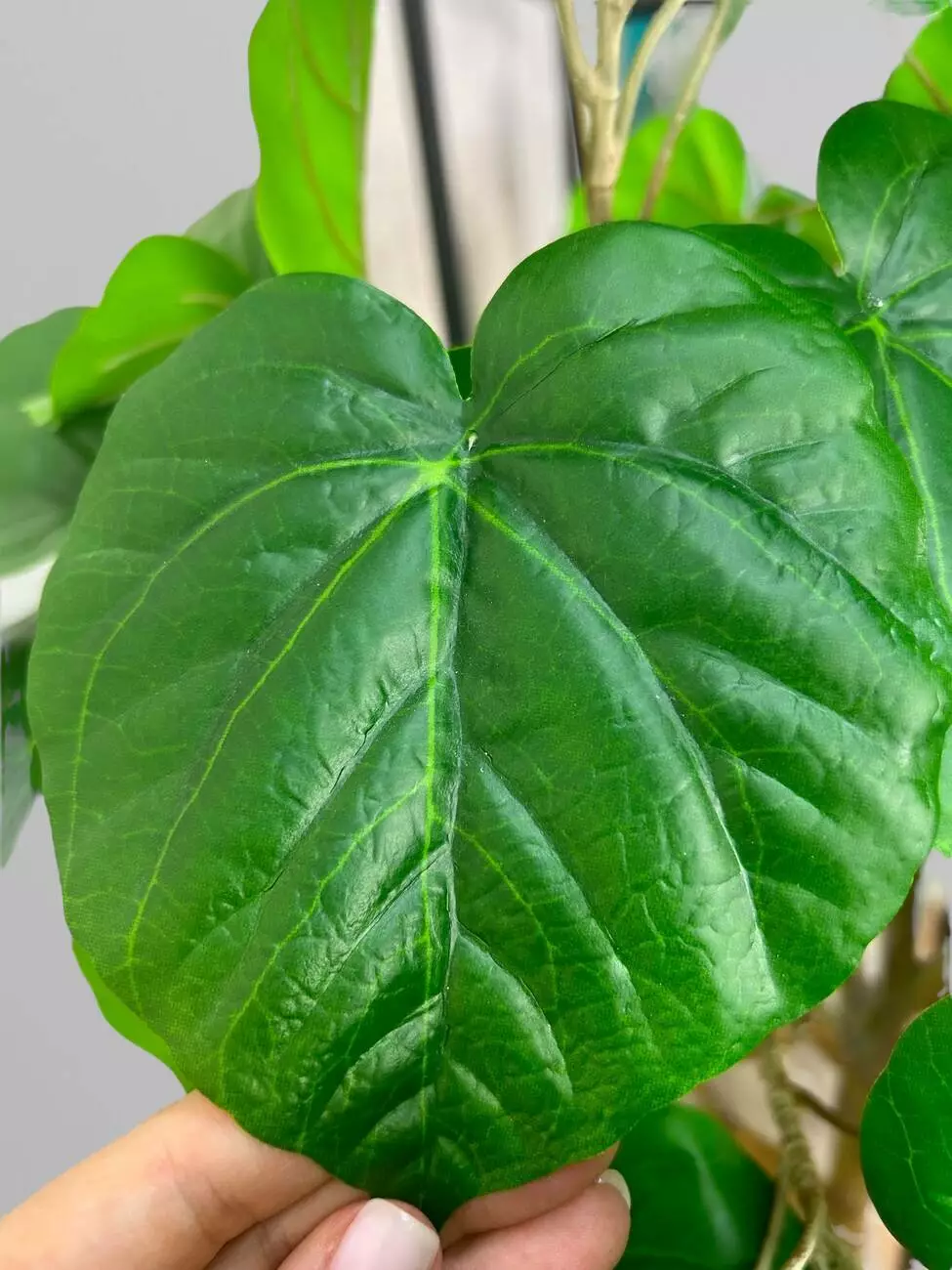 Реалістичні гілки та листя, виконані з якісного пластику, точно передають текстуру та колір живого фікуса. Завдяки дротяній основі ви зможете легко змінювати форму гілок, створюючи бажаний об’єм і вигляд. Зелене листя різних розмірів гармонійно розташоване по всій висоті, що надає рослині природного та елегантного вигляду.