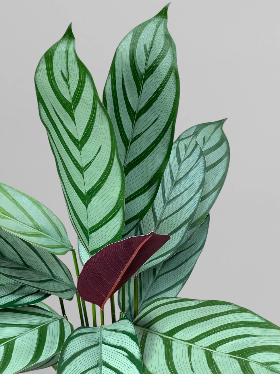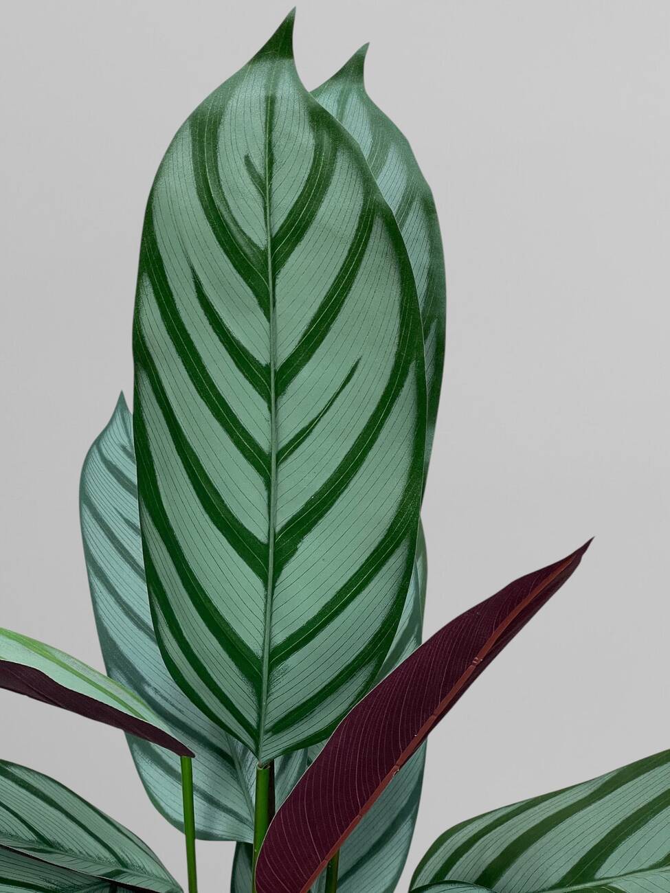 Яскравий кущ калатеї привертає увагу своєю формою та забарвленням. Вузькі листя темно-зеленого кольору з бордовою зворотною стороною. У листі є дріт, який дозволяє його вигинати та надавати потрібну форму. Кожен листок можна вийняти, і за необхідності їх можна поміняти місцями. Листочки виглядають ефектно завдяки своїй хвилястій формі, світло грає на них, створюючи блики, а де-не-де падає тінь.