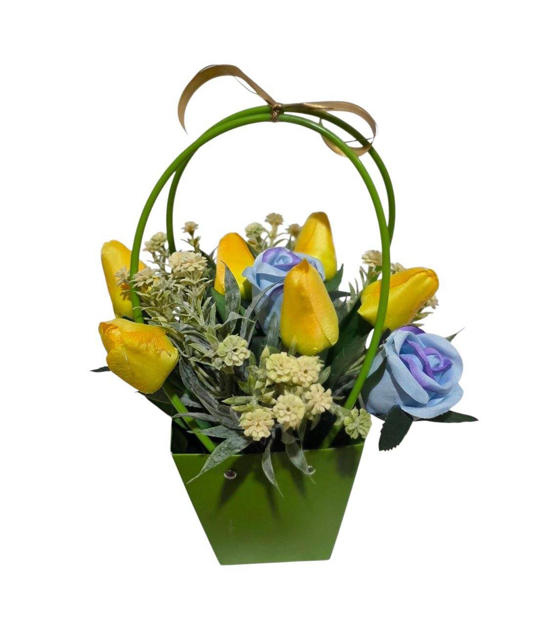 Сумочка паперова з 7 жовтими тюльпанами, 3 блакитними трояндами та