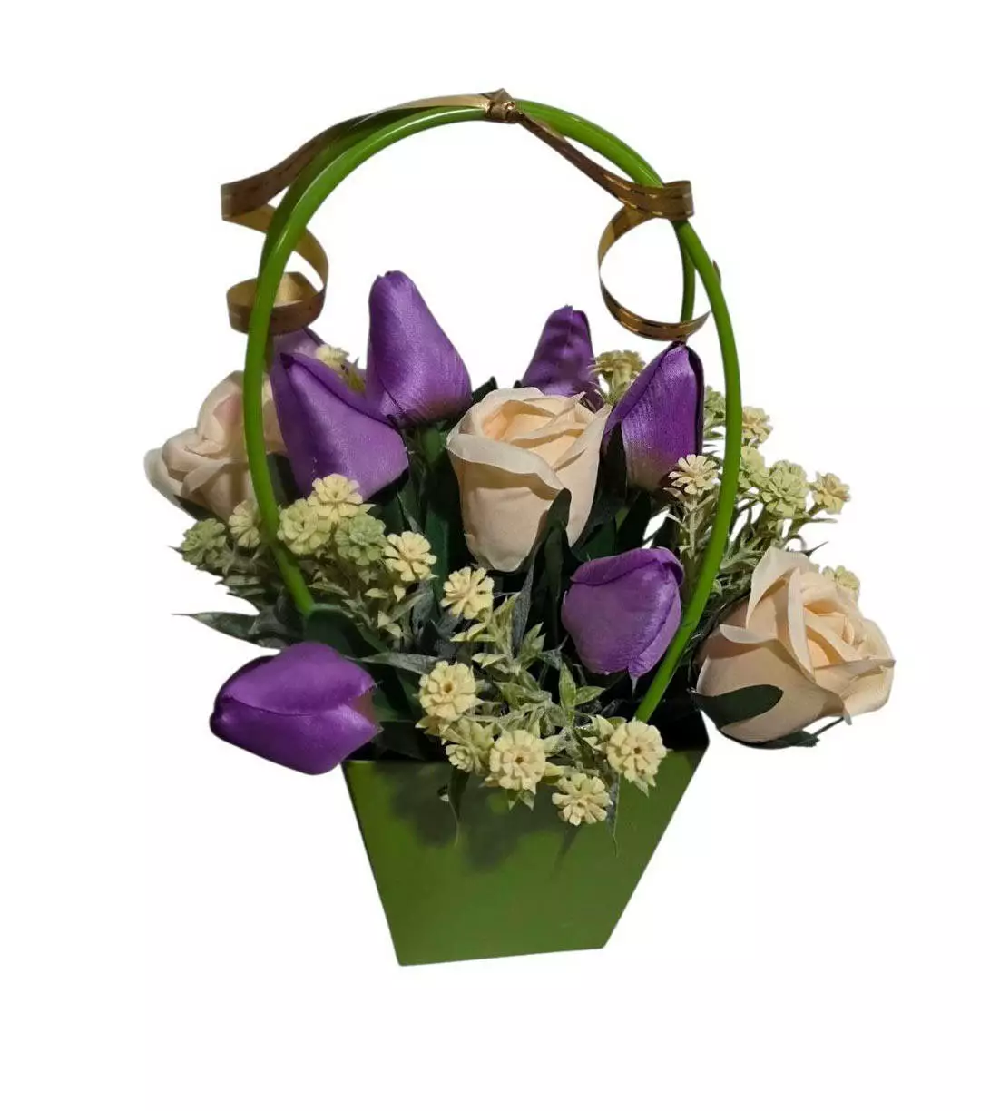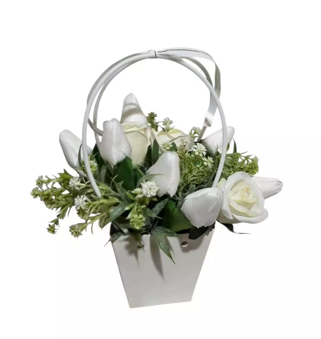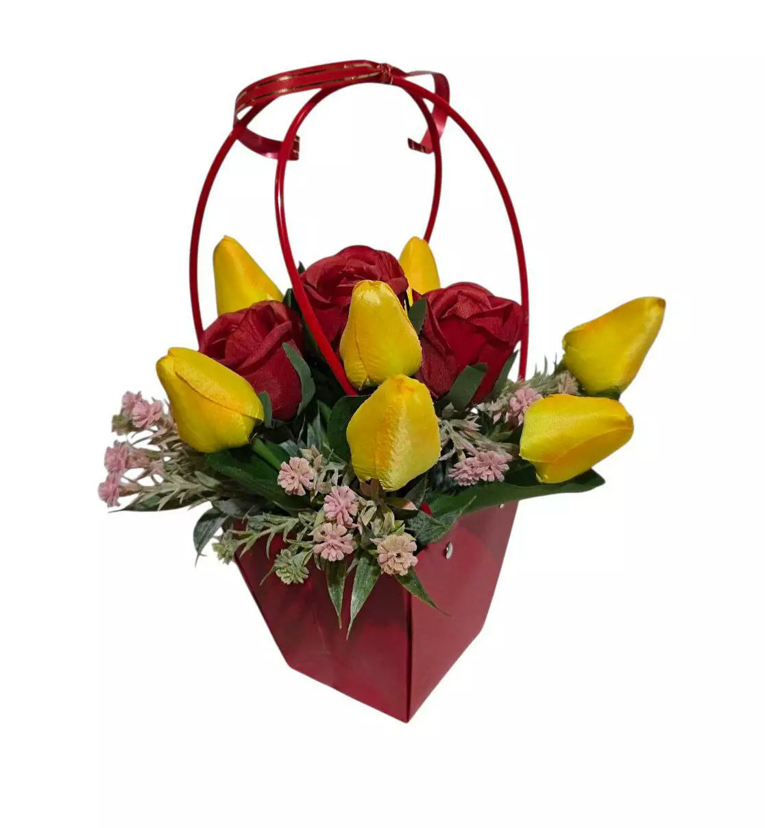 Сумочка паперова з 7 тюльпанами, 3 троянди та евкаліпт, розміром