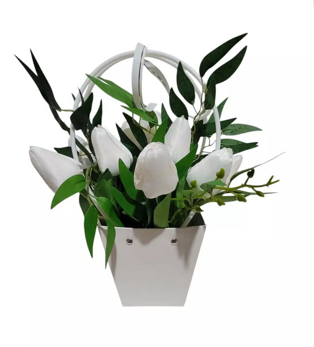 Сумочка паперова з білими тюльпанами на 14 голів та 2 гілочки