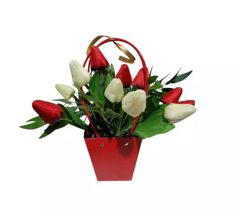 Сумочка паперова з червоно-білими тюльпанами на 14 голів та 2