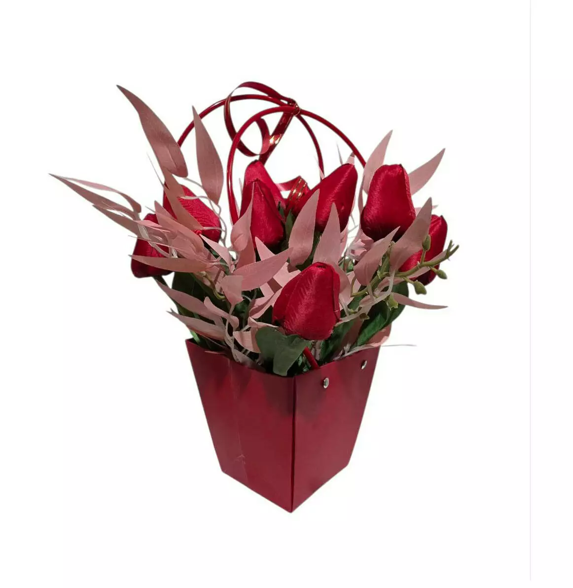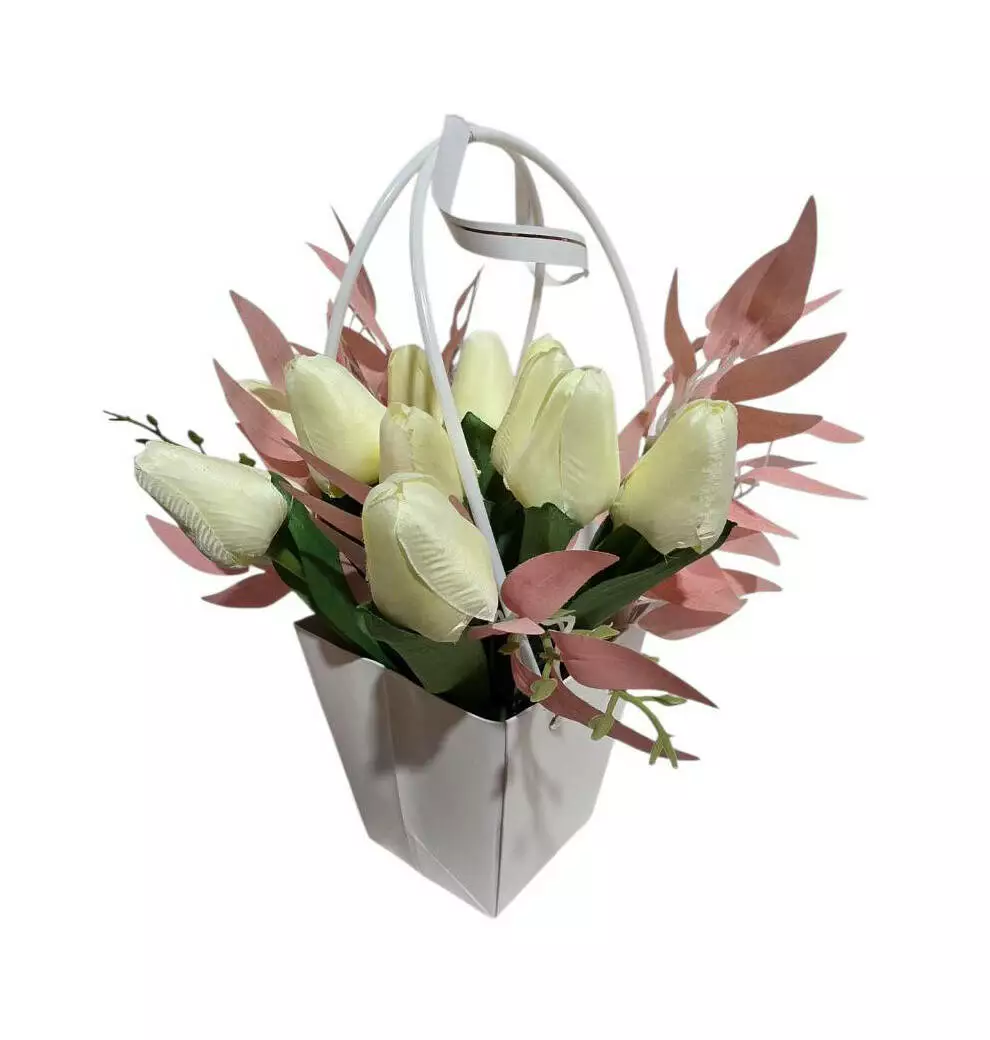Сумочка паперова з тюльпанами на 14 голів та 2 гілочки рускусу,