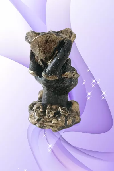 Ця загадкова та потужна ритуальна свічка у формі руки, що стискає троянду, прикрашена невеликими черепами, що надає їй глибокий символізм. Чорний колір уособлює трансформацію, захист і приховані знання, троянда символізує любов, таємні бажання та внутрішню силу, а черепа нагадують про мудрість предків і неминучість змін.