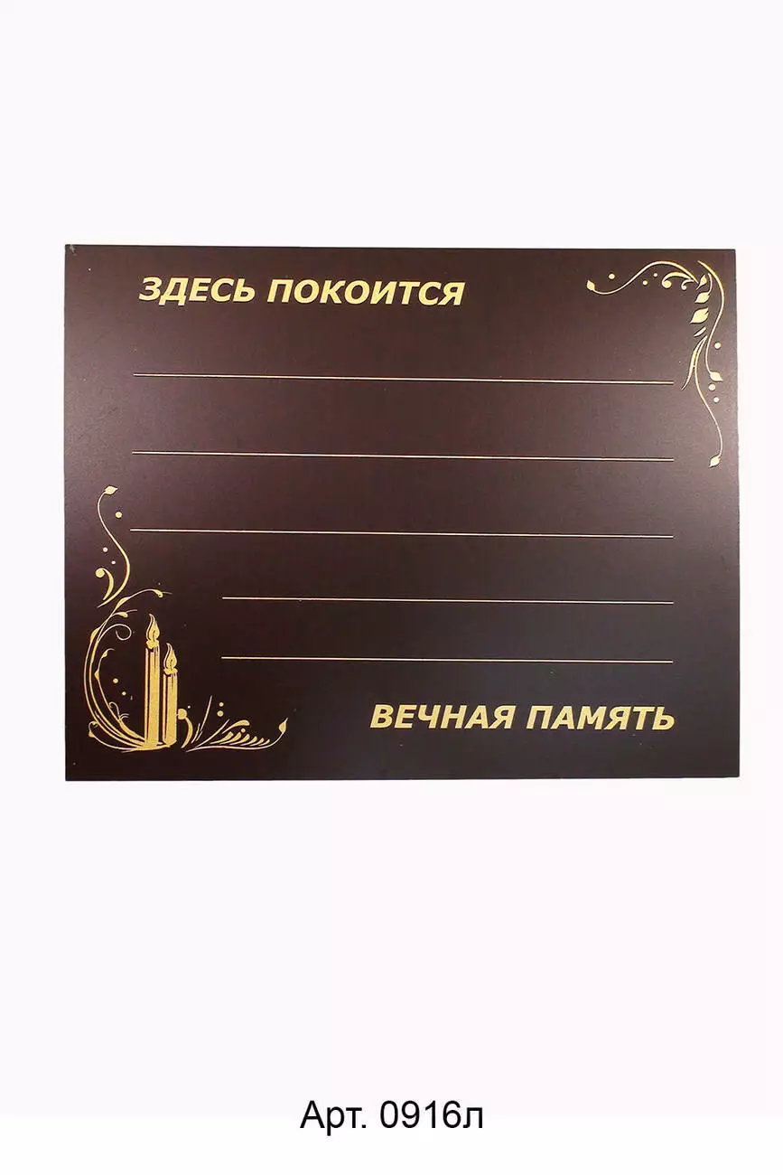 На табличці надруковано свічку та декоративні вензелі по кутах та