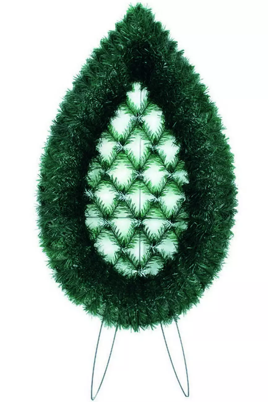 Вінок зі штучної хвої у формі краплі, по центру заплетений сіткой,