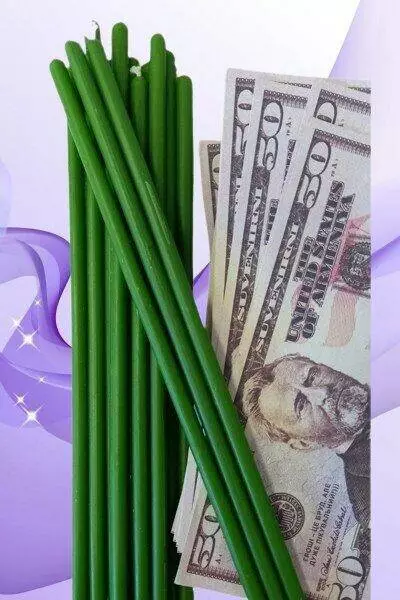 Зелена свічка несе в собі енергію багатства, достатку та любові, фінансового добробуту, багато здоров'я. Зелена воскова свічка використовується для приваблення грошей, добробуту, успіху в кар'єрі та власному бізнесі. Крім багатих, зелений колір безпосередньо пов'язаний з усіма начинками.